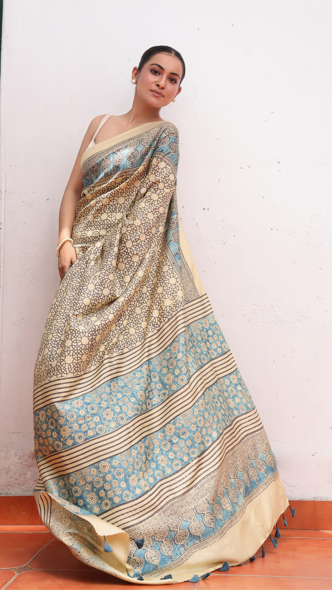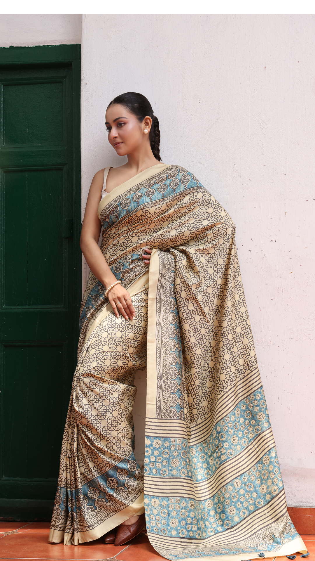 'KAMLAPATI: Butter' Ajrakh Handwoven Mulberry Silk Saree
