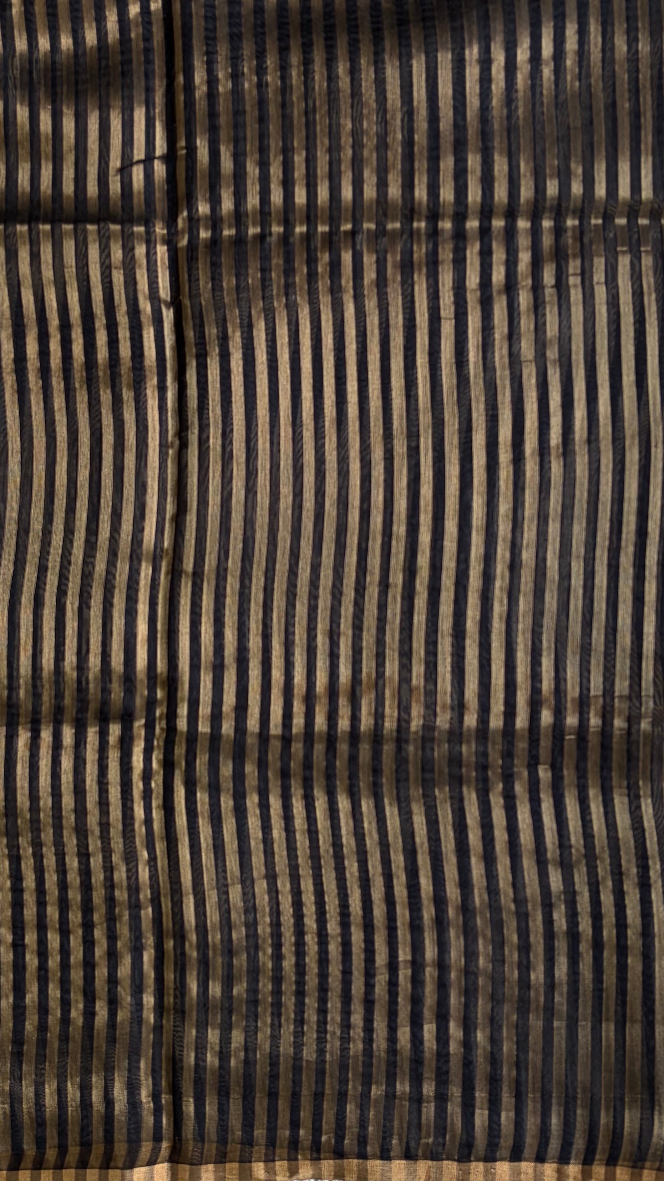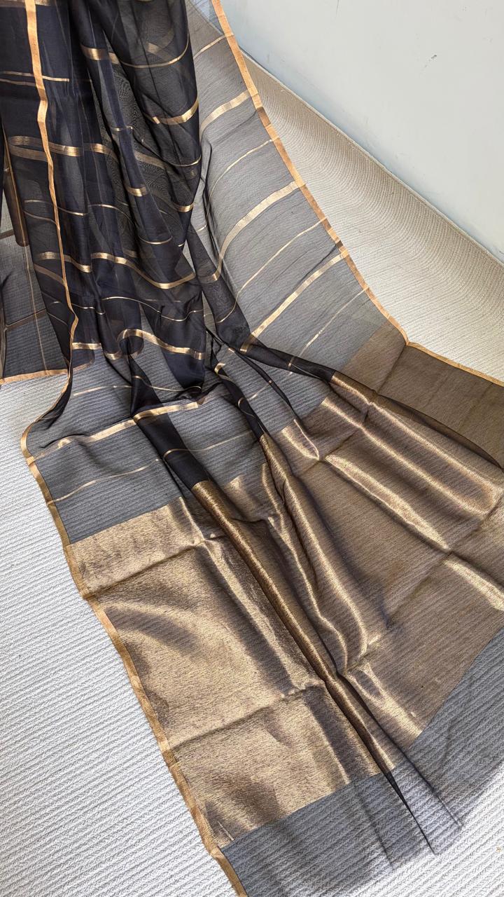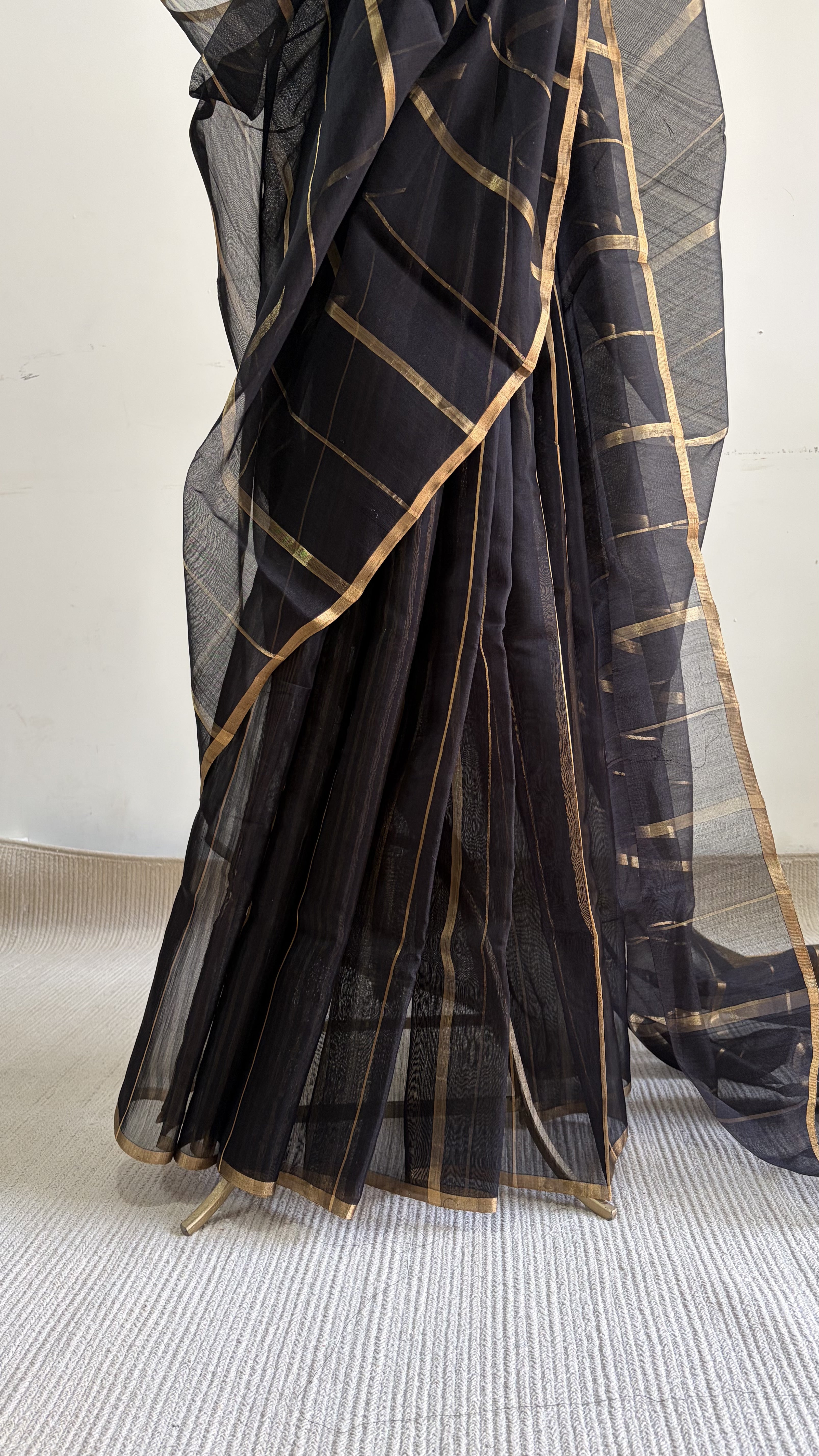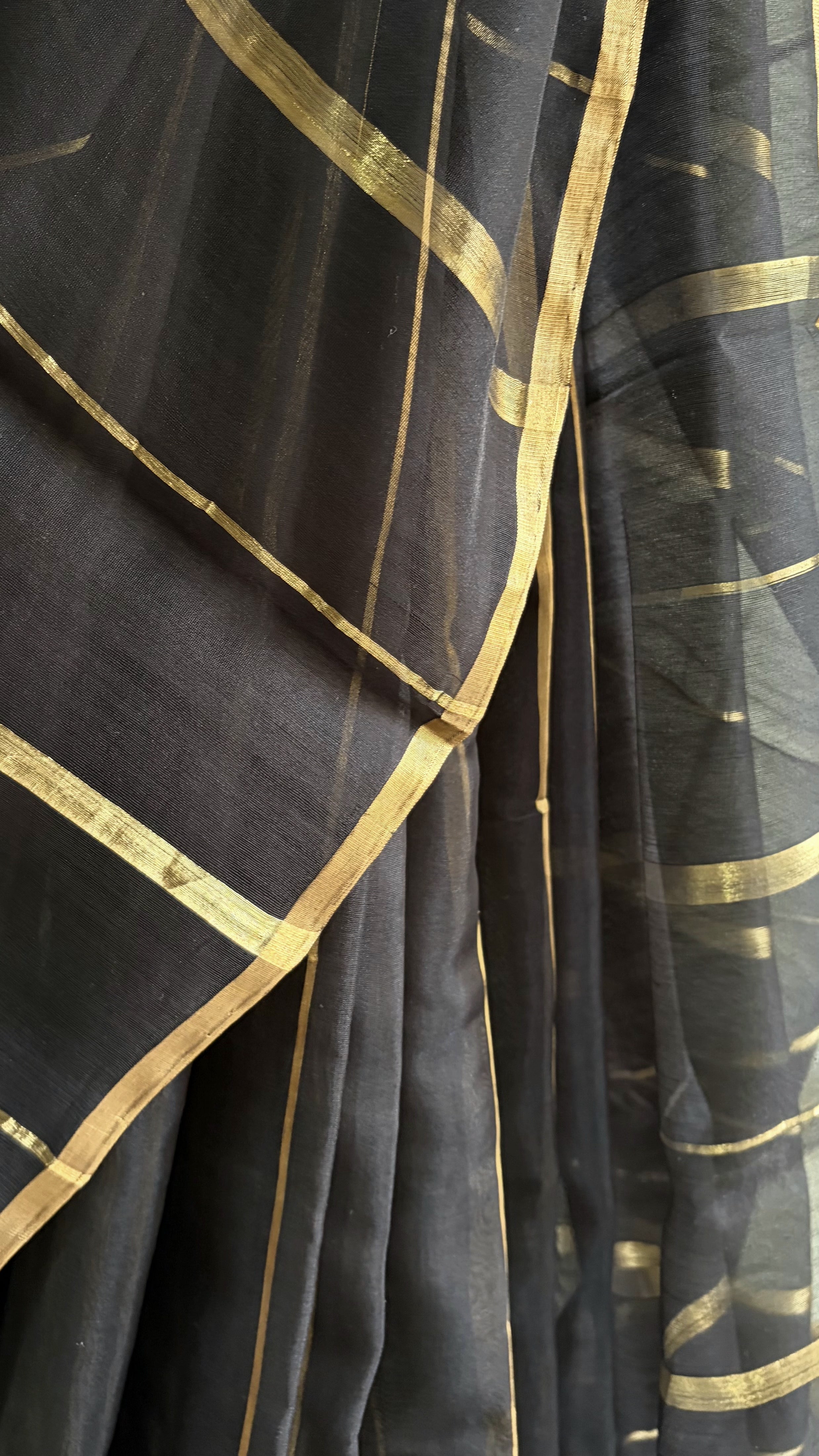 A striking Chanderi silk-cotton saree in a deep black shade, featuring vertical gold zari stripes woven across the body in varying widths, creating a refined rhythm and luminous contrast.