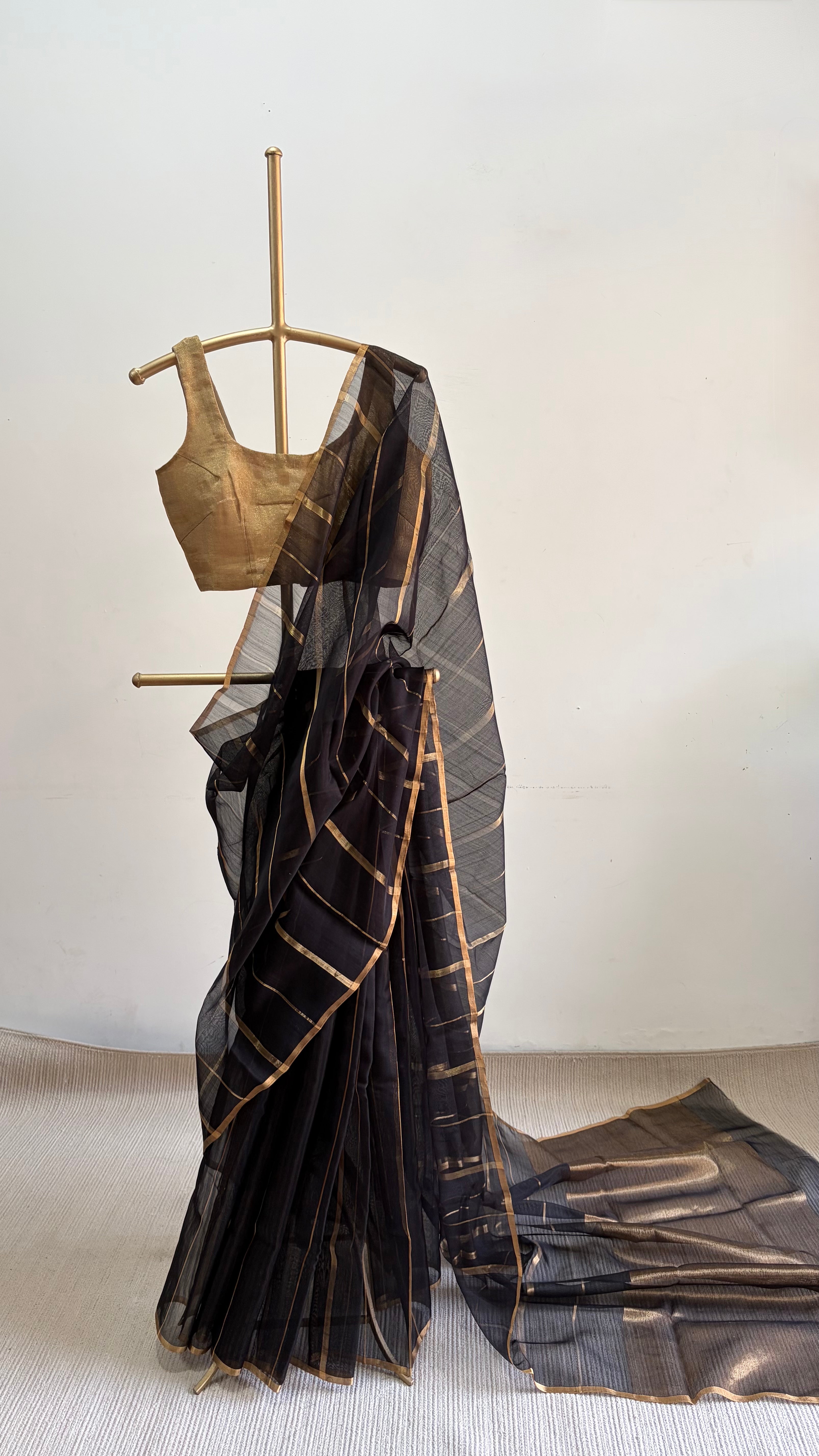 It comes with a running blouse piece in matching black, detailed with gold zari stripes for a coordinated finish.