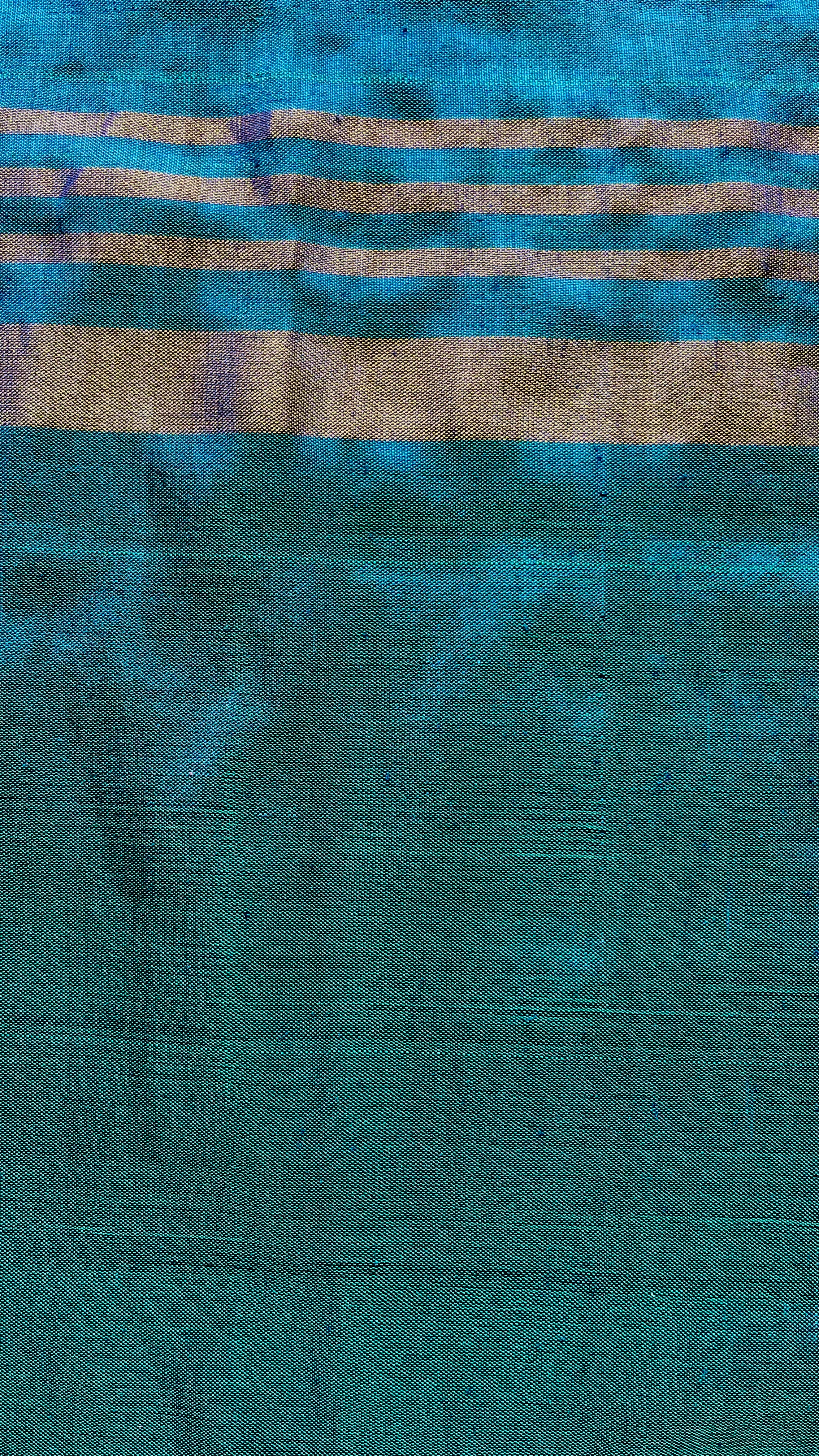 The border is designed with a 2-inch teal green band, followed by golden zari stripes, and finished with a dark blue edge along with a 1-inch zari band. This layered design lends the drape a refined traditional charm.