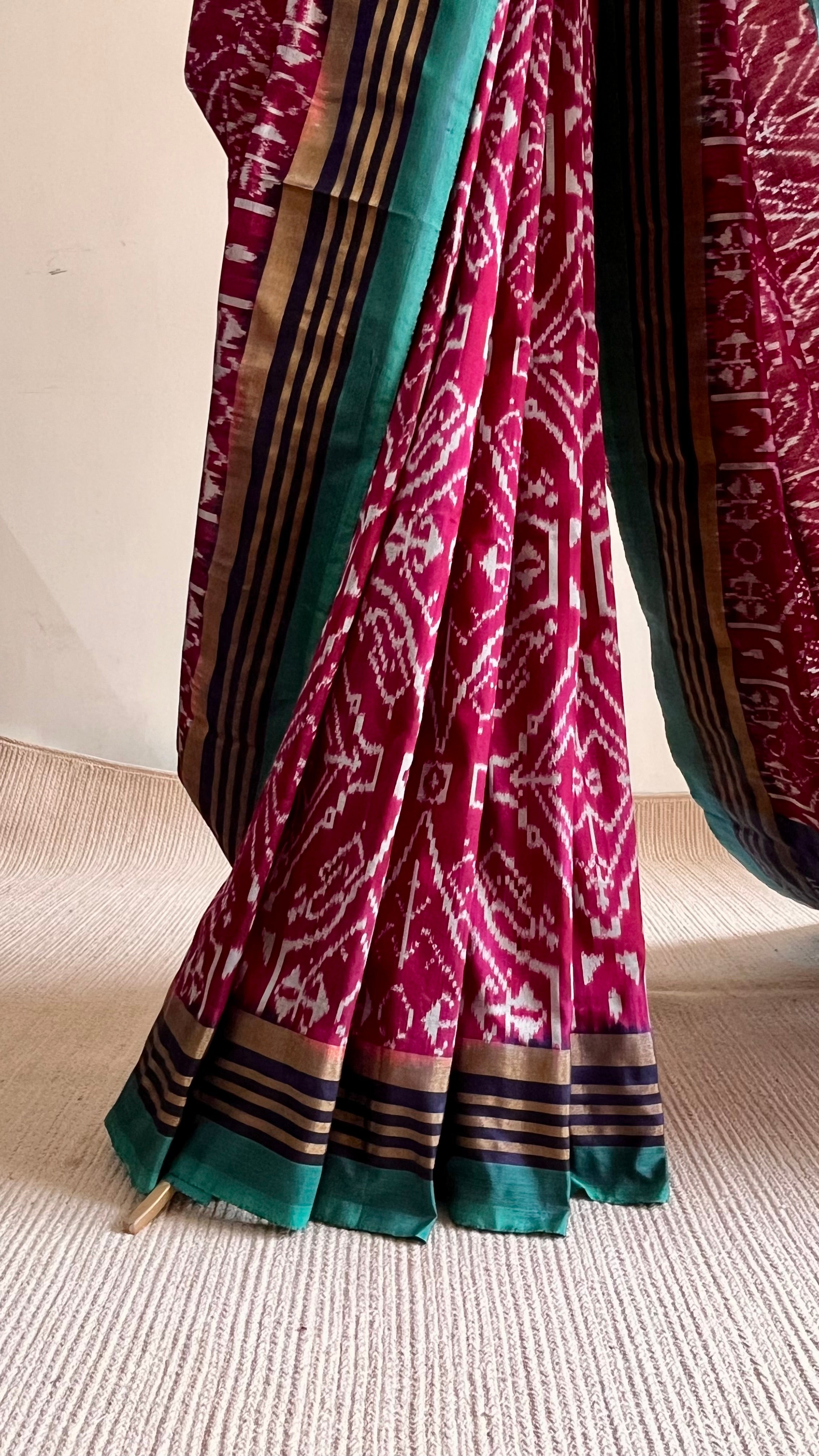 This handwoven Pochampally silk ikat saree comes in a striking tri-colour combination with the body in a rich cranberry shade. It is adorned with large circular and diamond-shaped ikat motifs in white, created using the traditional resist-dyeing technique.