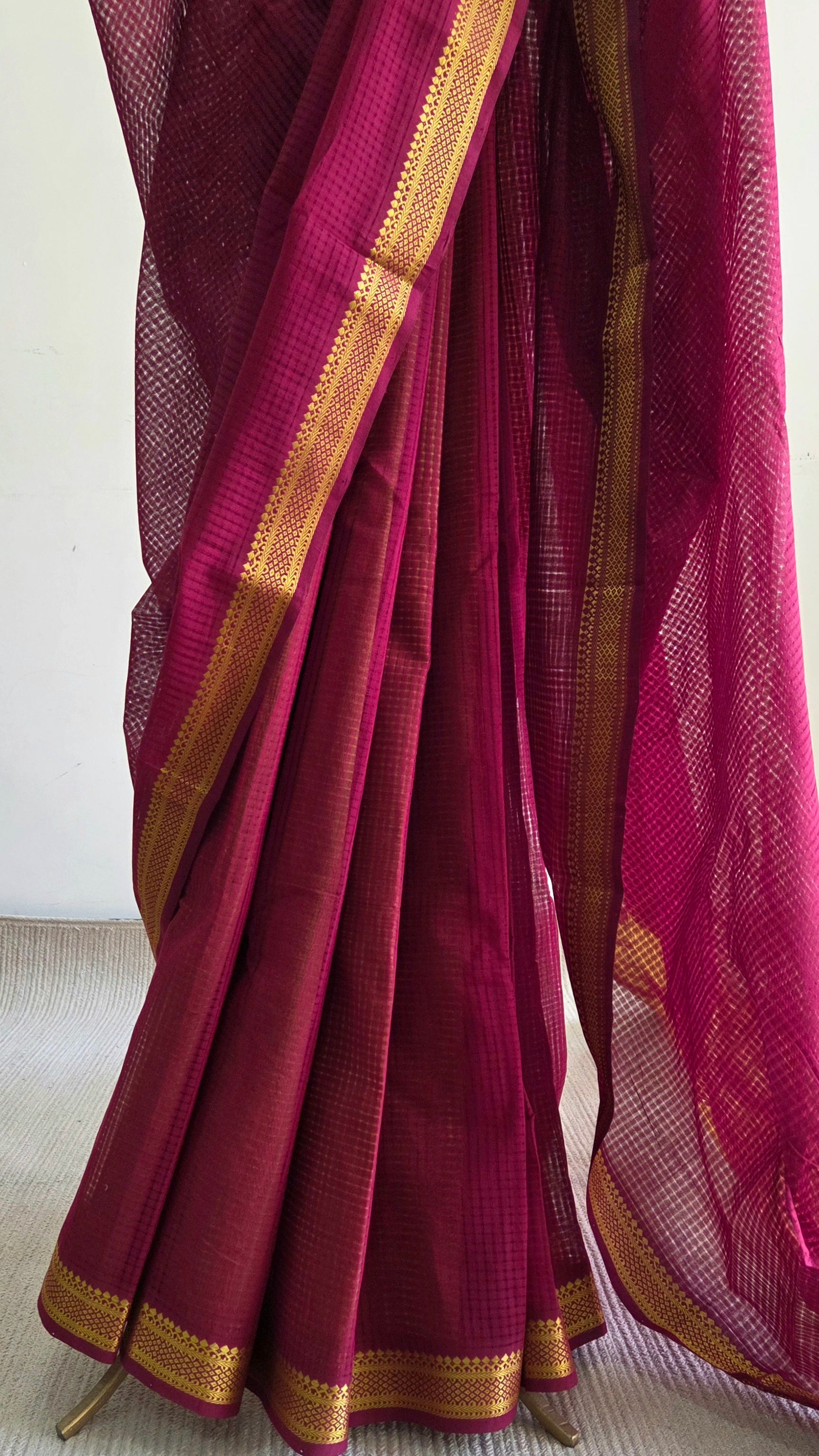 A rich maroon-pink saree with an intricately woven body that creates a subtle missing checks texture, adding depth and refined character to the weave.