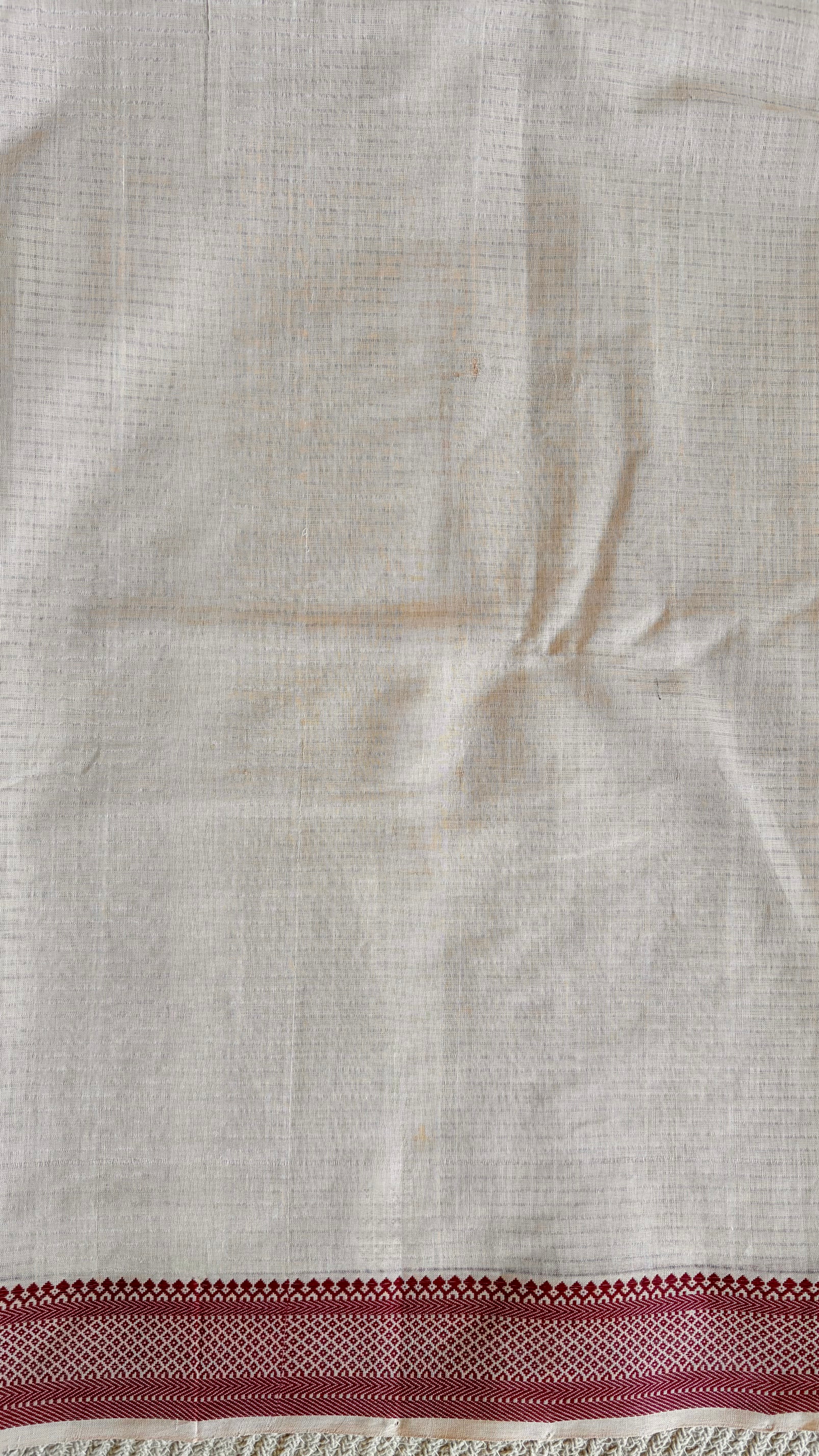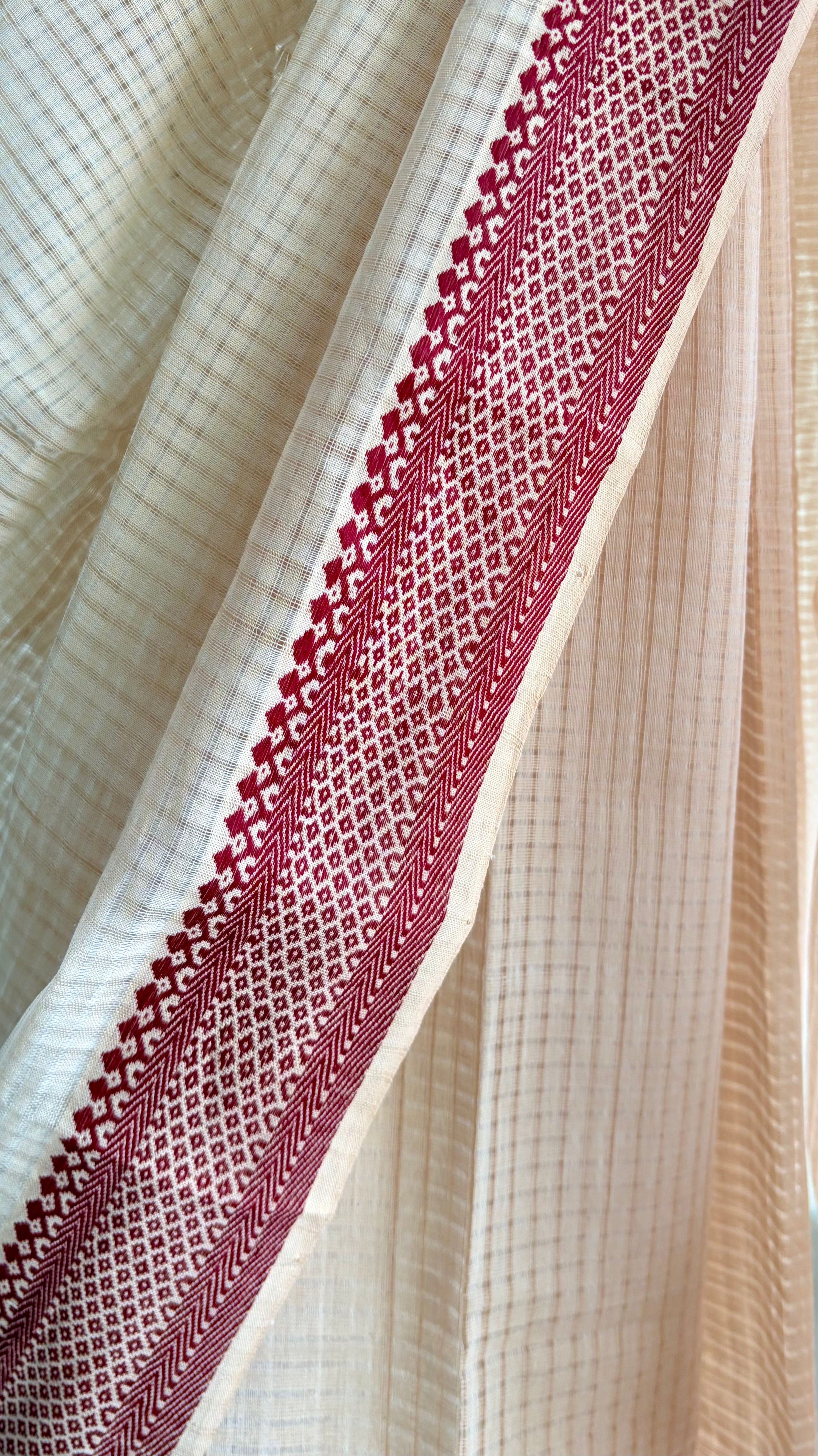 A soft ivory shade saree with an intricately woven body that creates a refined missing checks texture, lending depth and understated elegance to the fabric.