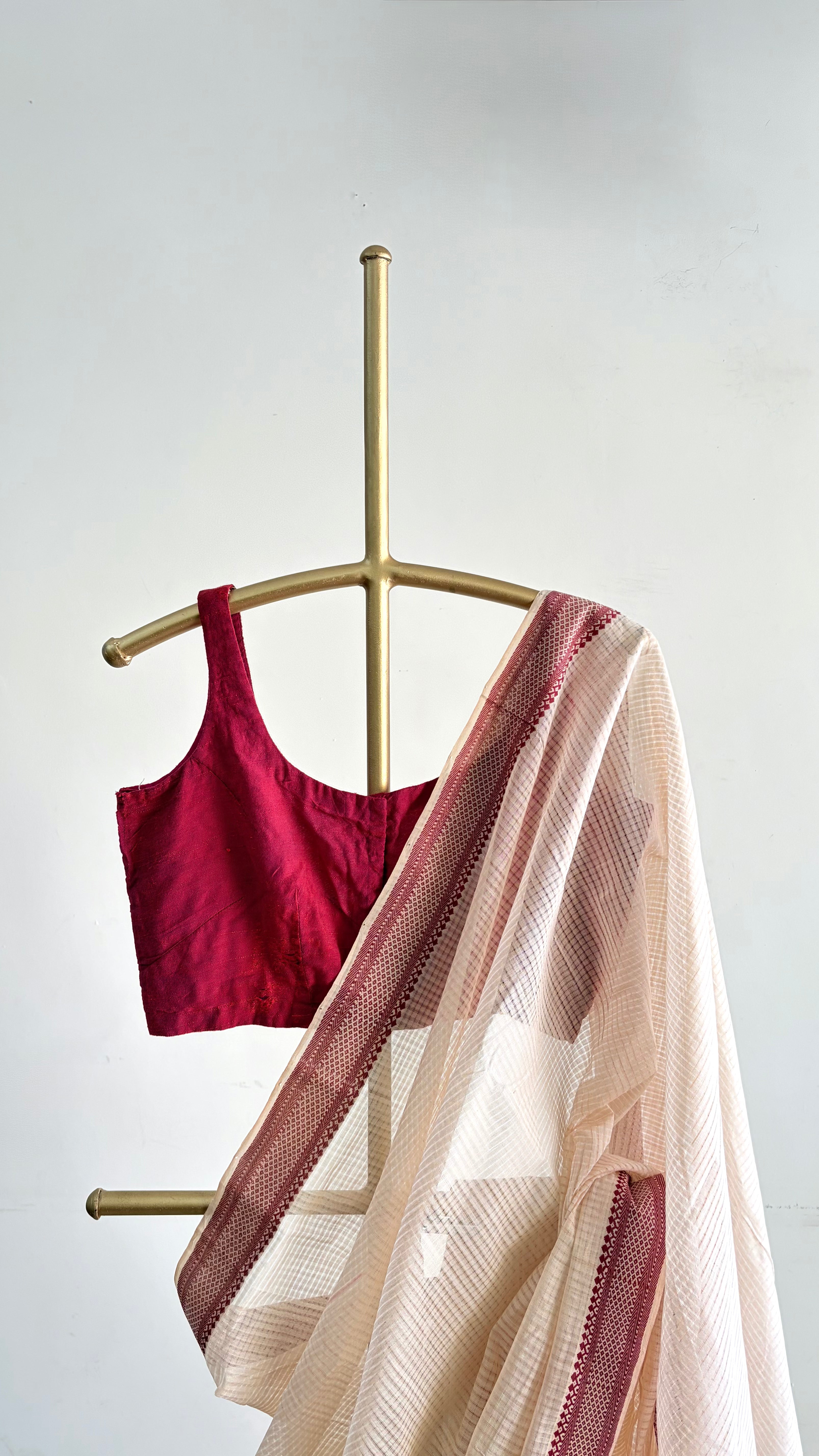 The border features a delicate thread-nizam weave in a rich cranberry shade, adding a subtle yet striking frame to the saree.