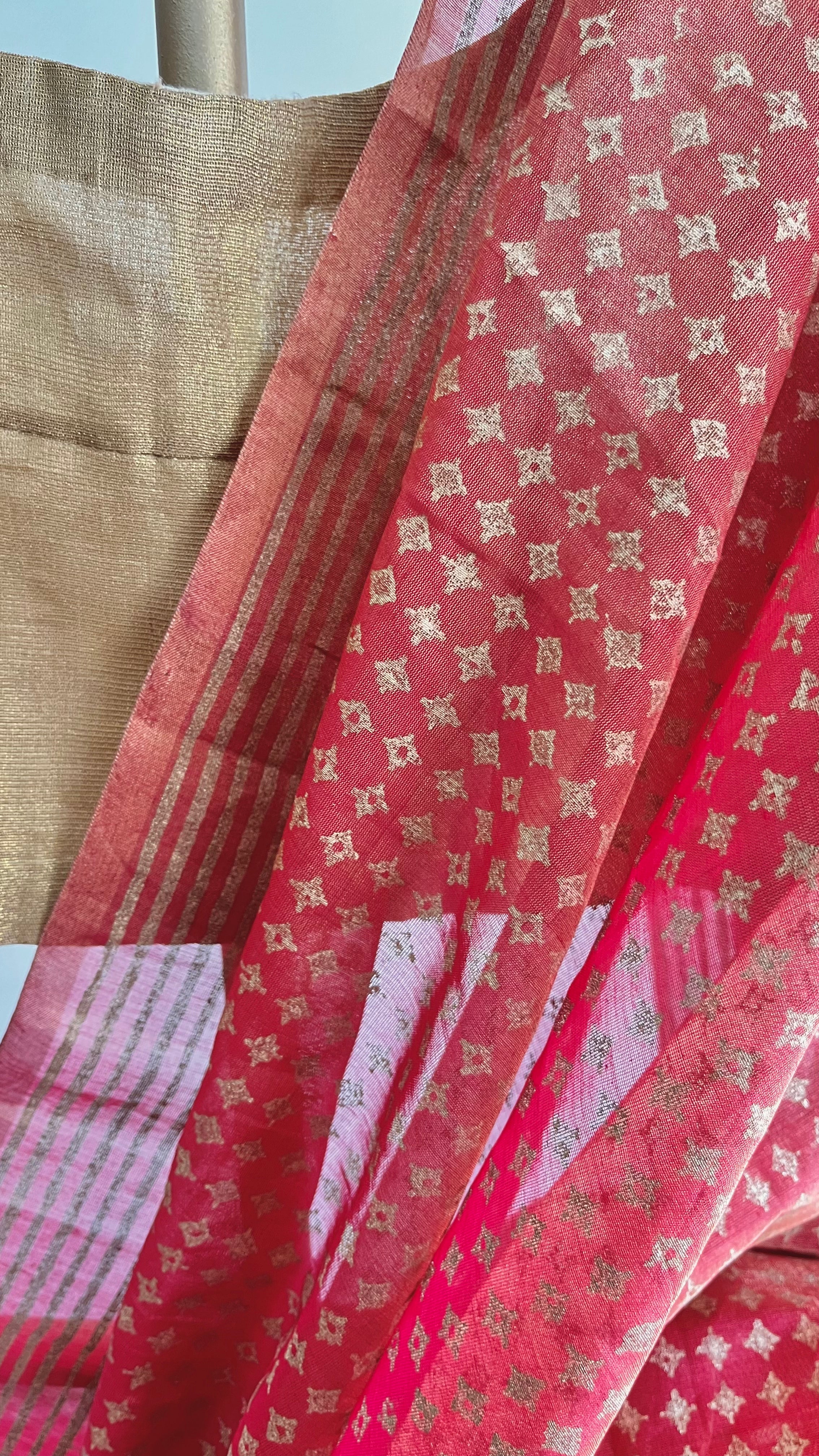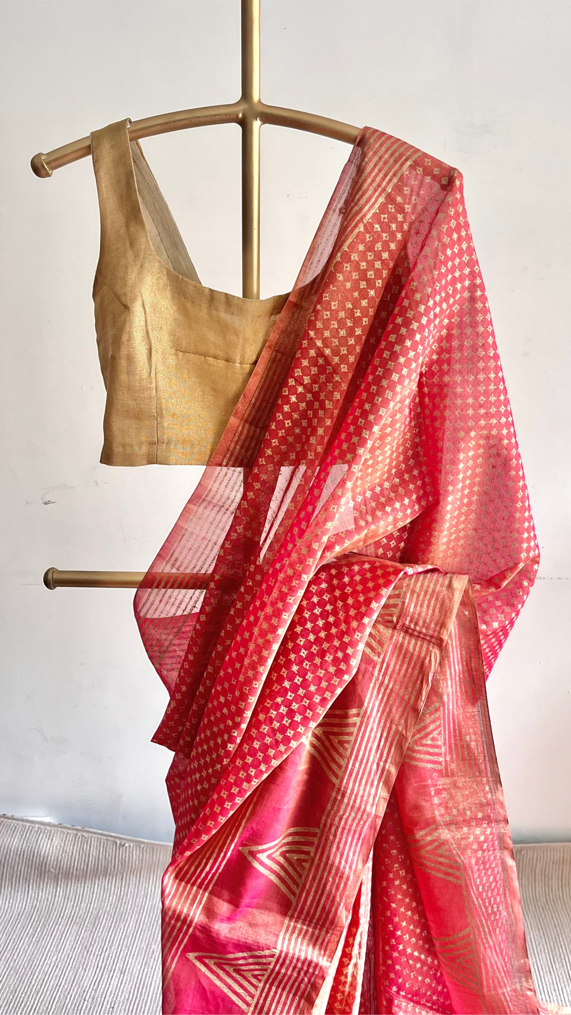 This handwoven Tissue Maheshwari saree is crafted in a vibrant tomato-pink shade. The body features small diamond motifs in gold print all over, creating a rich and elegant texture. The upper border showcases a band of golden stripes in block print, while the lower border mirrors the same golden stripes and is accentuated with long-triangular prints.