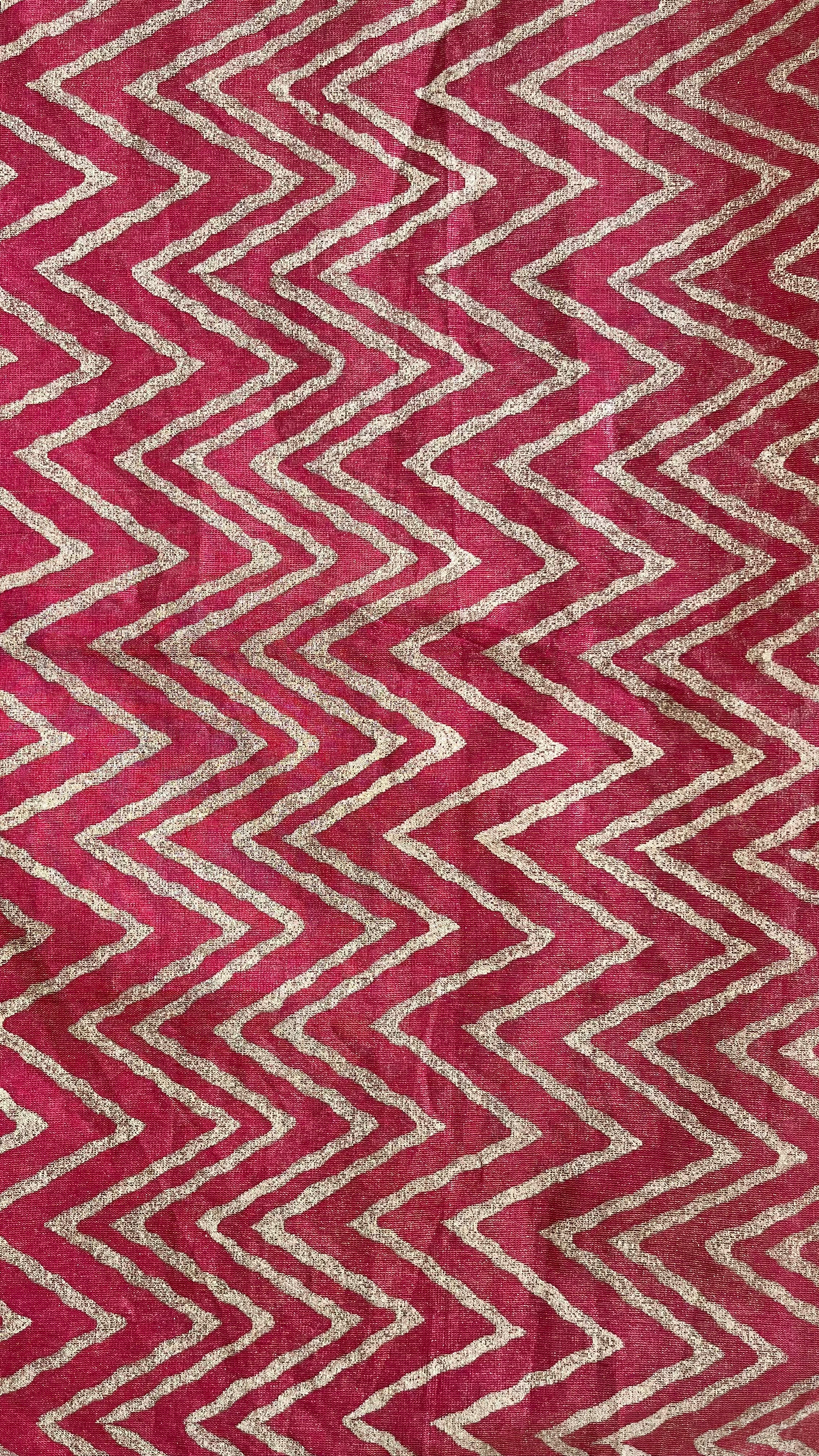 The pallu has a panel of zari stripes woven, enhancing the overall luxurious appeal. Perfect to wear for: festive occasions, traditional ceremonies, and elegant daytime events.This saree comes with a blouse piece in the same tomato-pink base as the body, featuring an irregular chevron pattern in gold print.