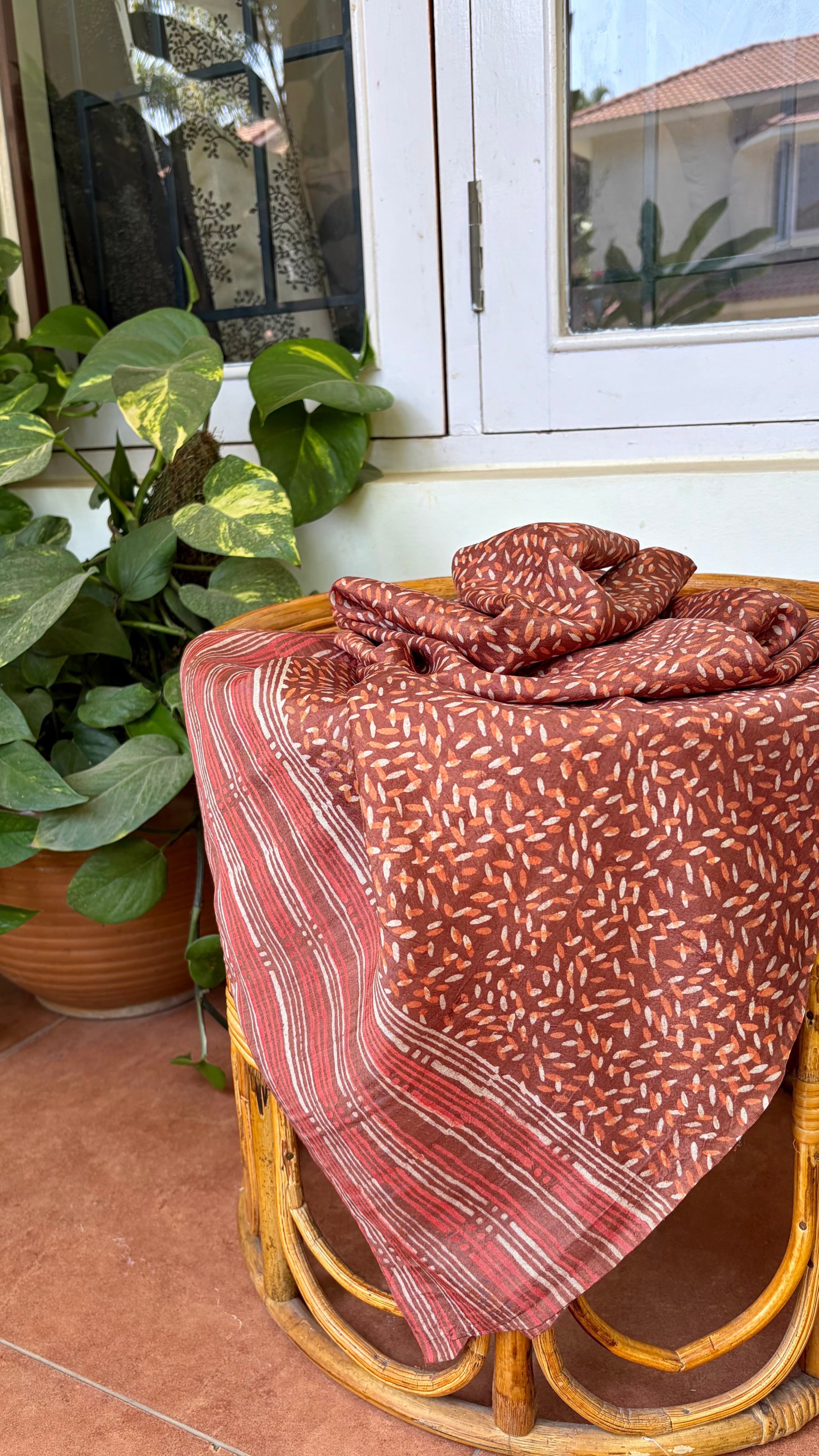 Brown base stole featuring a seed-like overlay print in light grey and peach, finished with irregular stripes in matching shades at the ends.