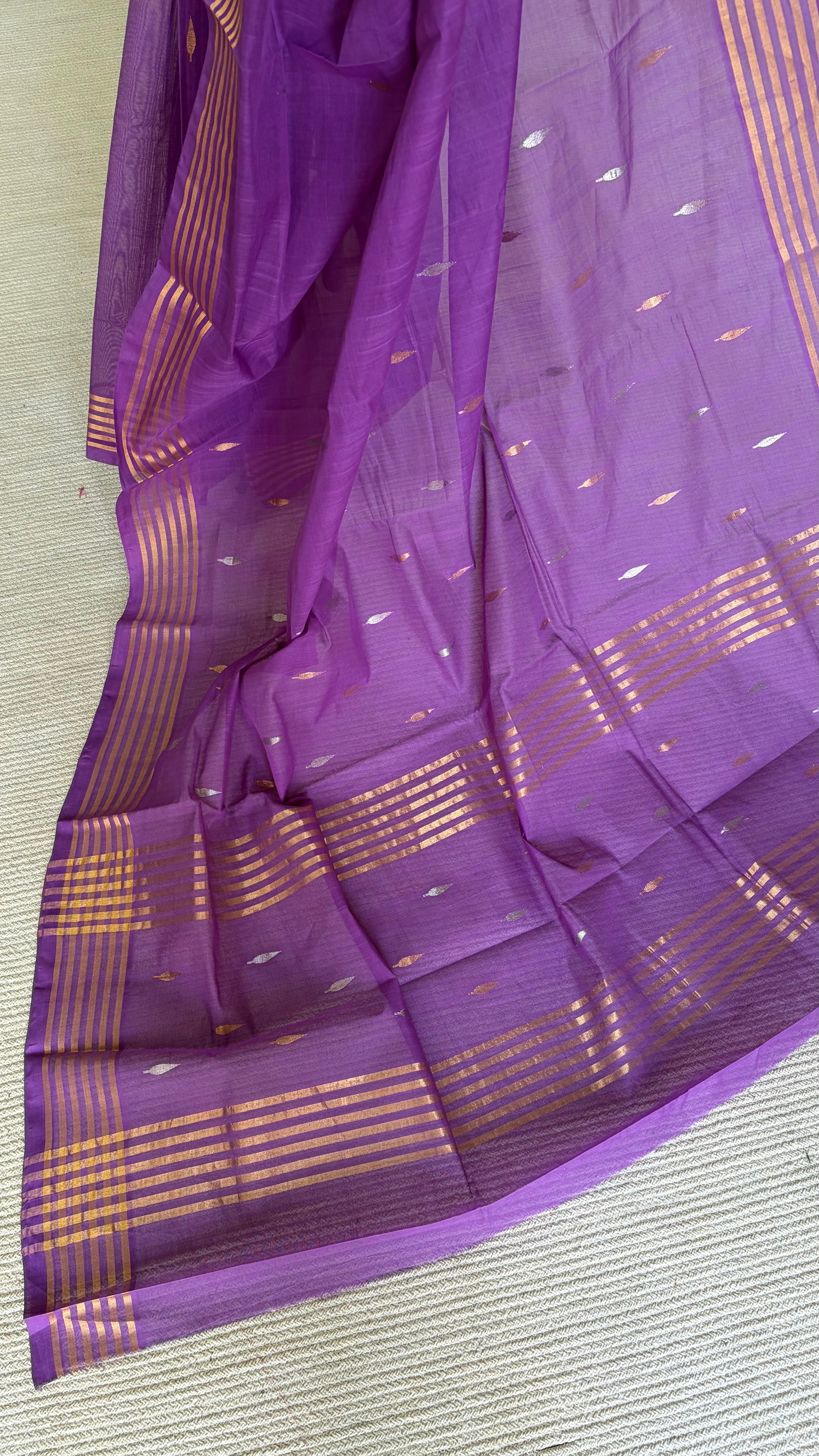 Handwoven cotton Venkatagiri saree in amethyst purple saree woven with leaf-like extra-weft motifs in gold and silver zari scattered across the body, creating a subtle, luminous foliage pattern that catches light with every movement.