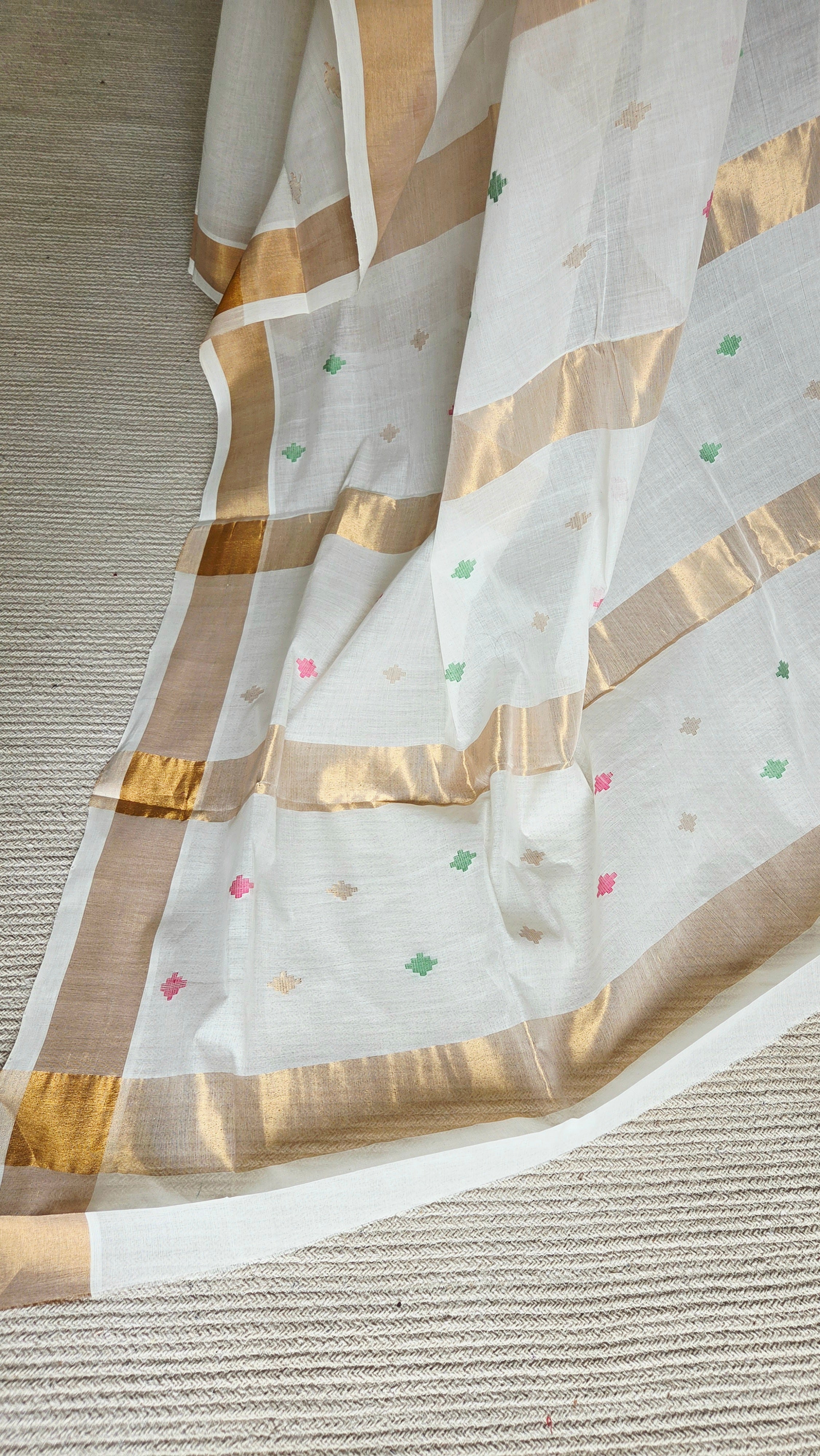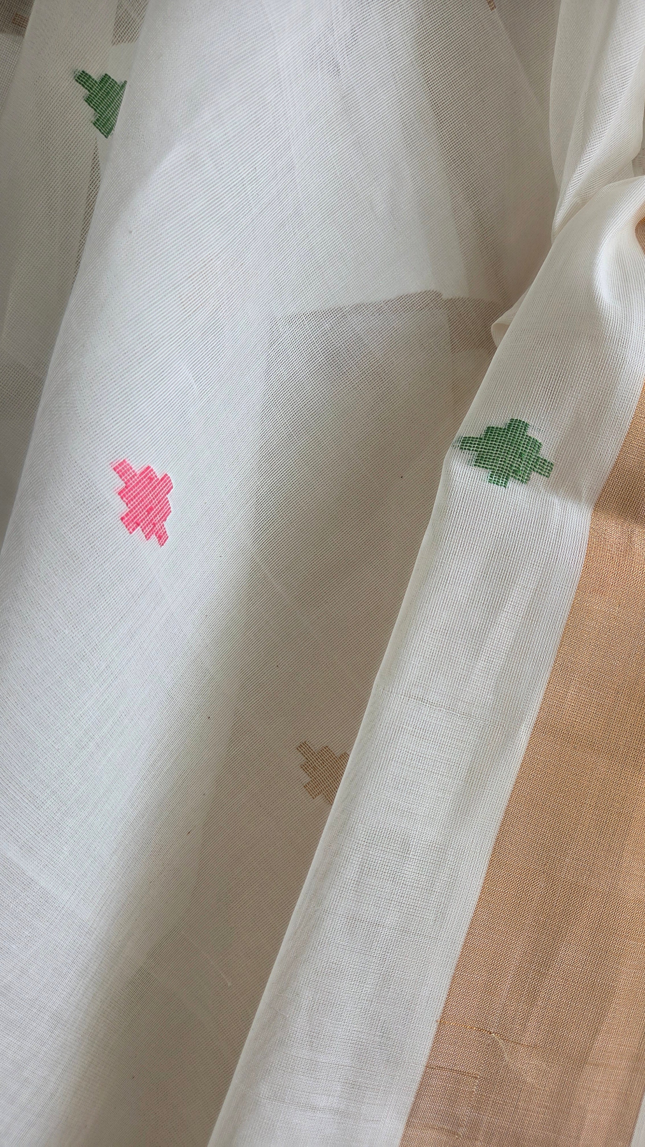Handwoven cotton Venkatagiri saree in Off-white base with a geometric, diamond-like extra-weft motif woven in pink, green and gold zari all over the body, adding subtle colour accents and a refined metallic sheen.