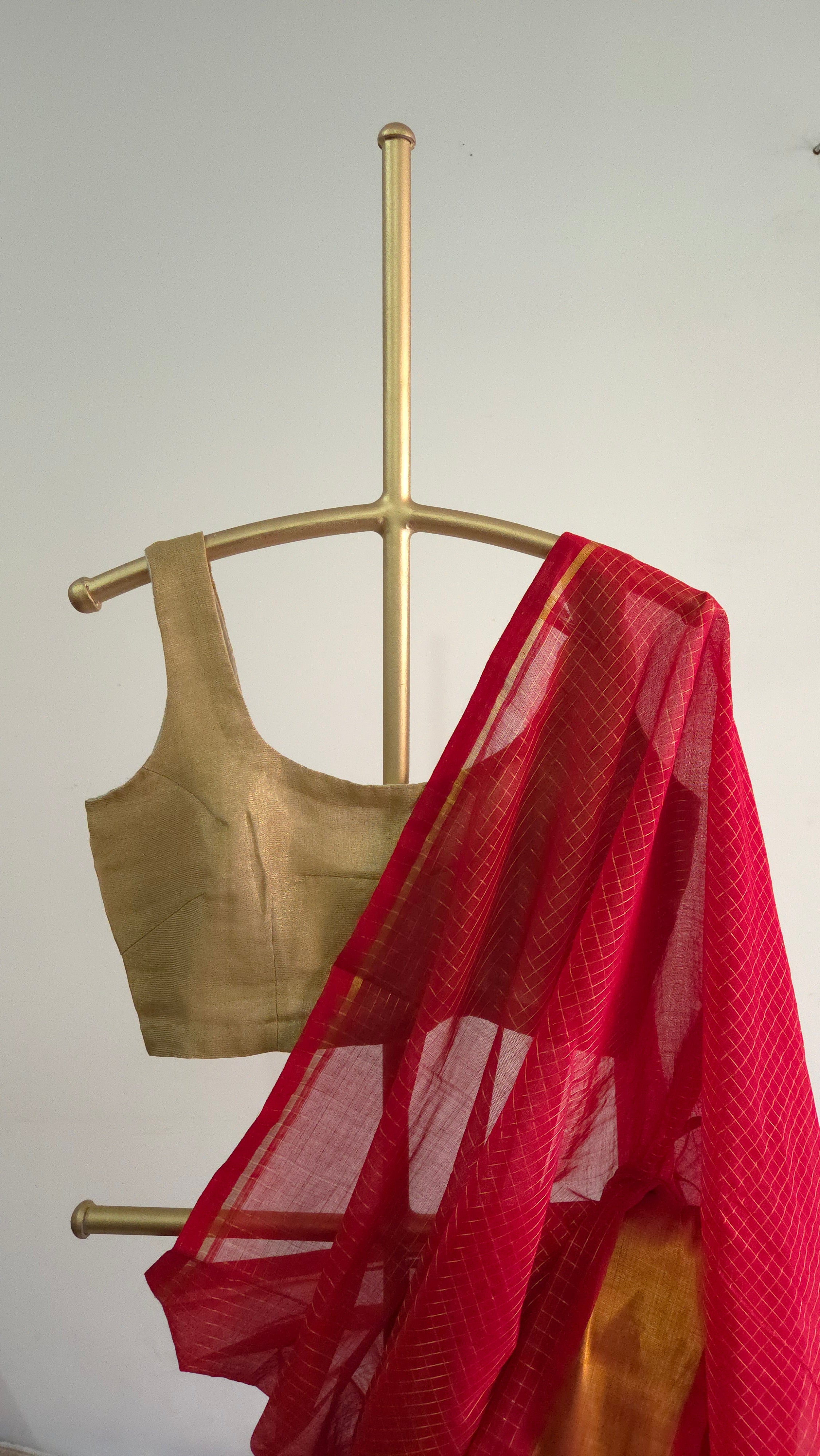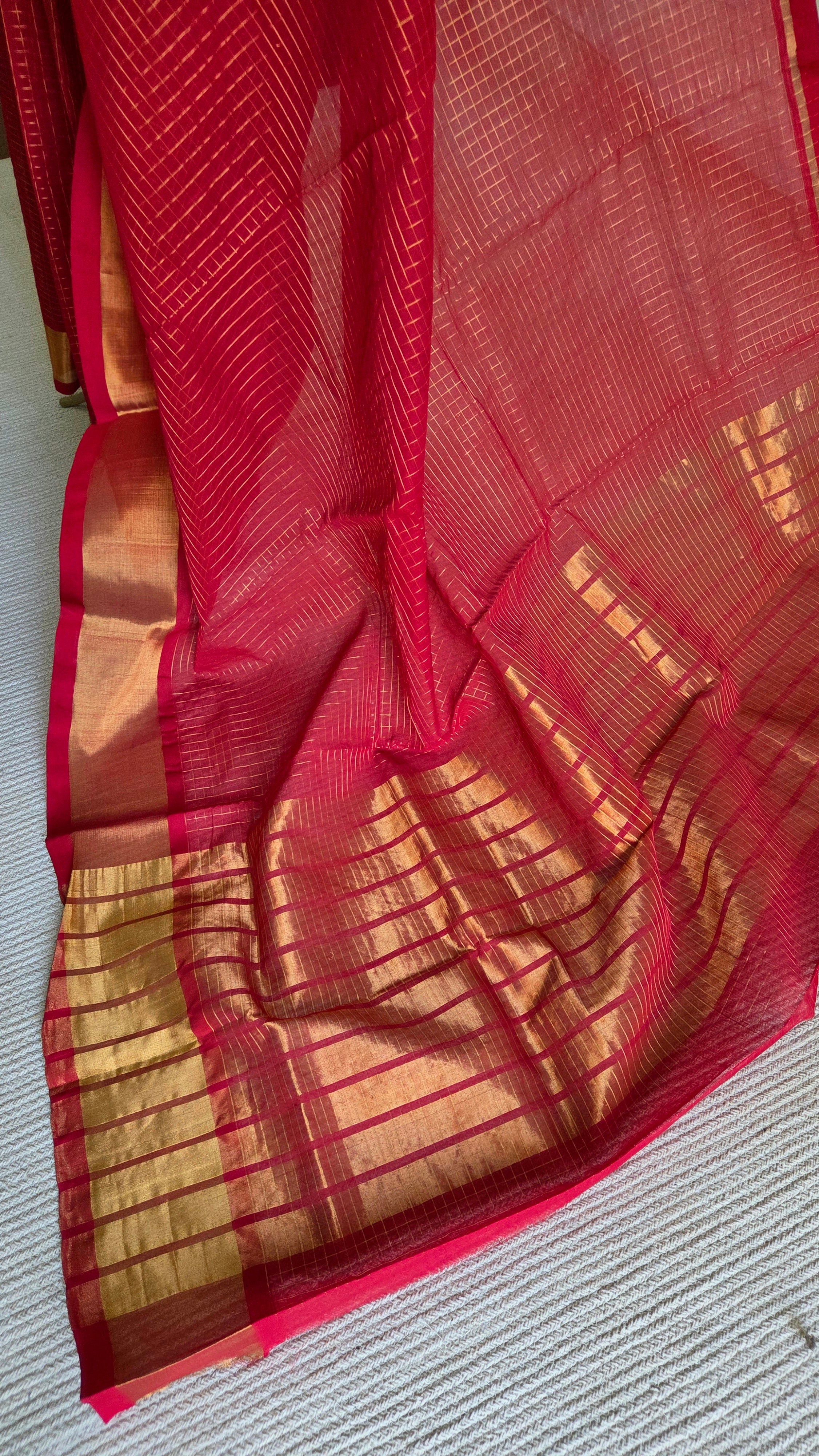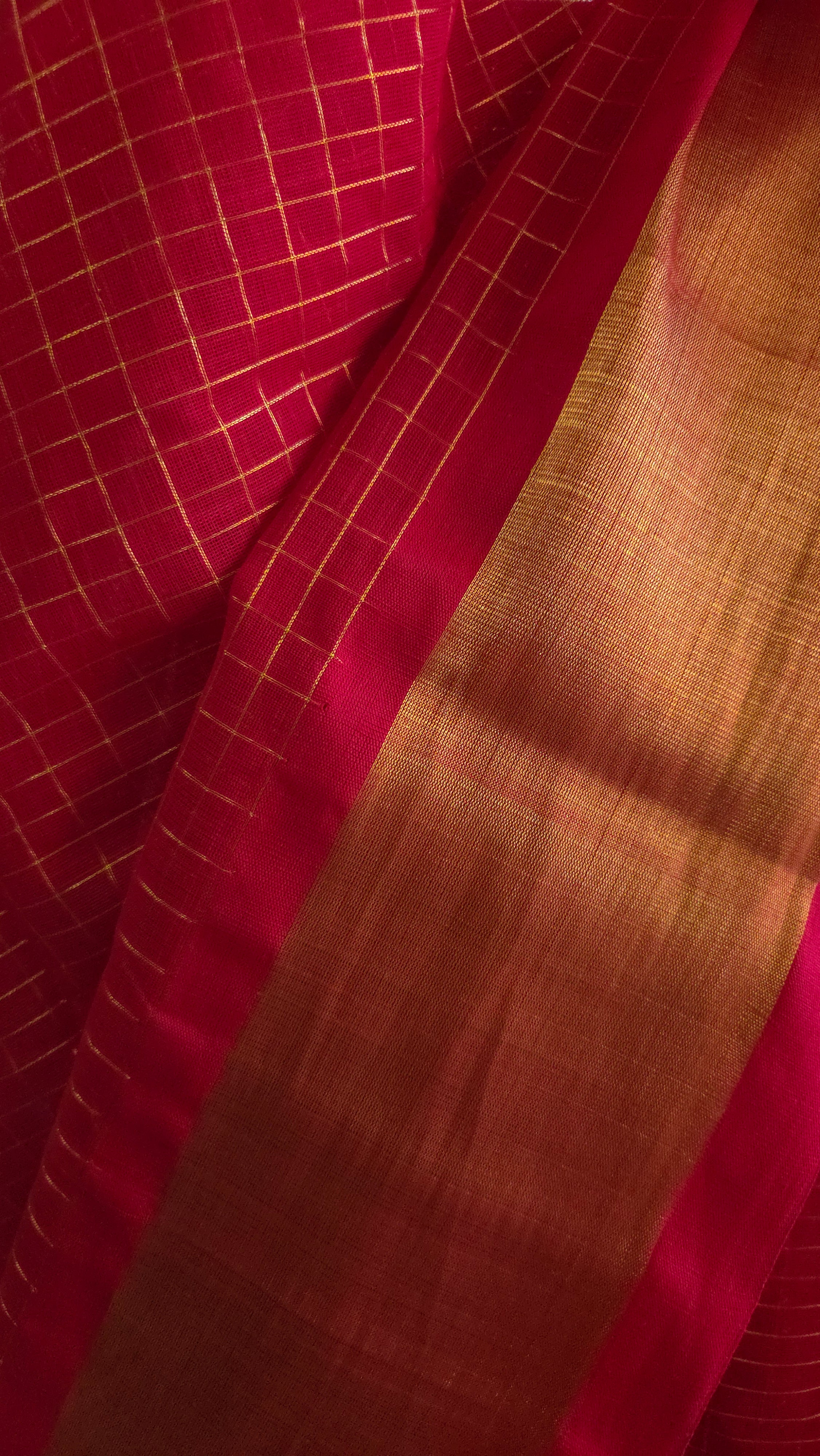 Handwoven cotton Venkatagiri saree in red base saree woven with tiny golden zari checks all over the body, creating a subtle metallic grid that catches light and adds elegant texture without overwhelming the ground.