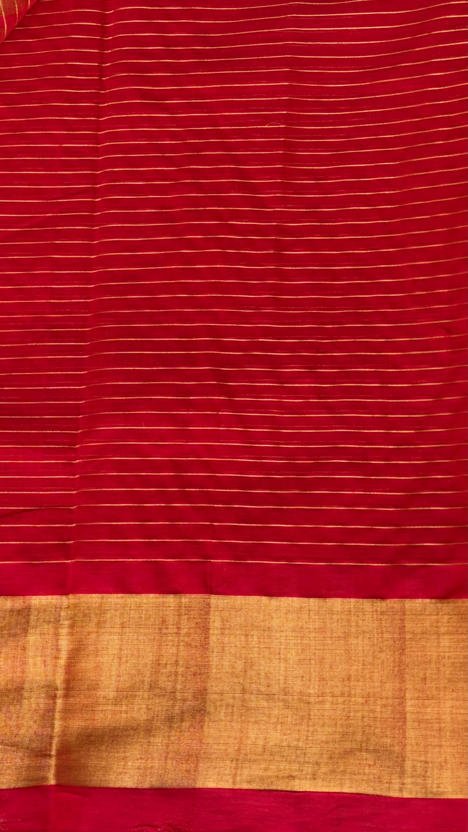 The upper border is finished with a thin golden zari stripe, while the lower border features a prominent 3.5" gold zari band that grounds the drape with a luxurious weight.The pallu is woven with vertical golden zari stripes that lengthen the silhouette. Perfect to wear for: daytime festive gatherings, family pujas, office ethnic days, and casual wedding functions.