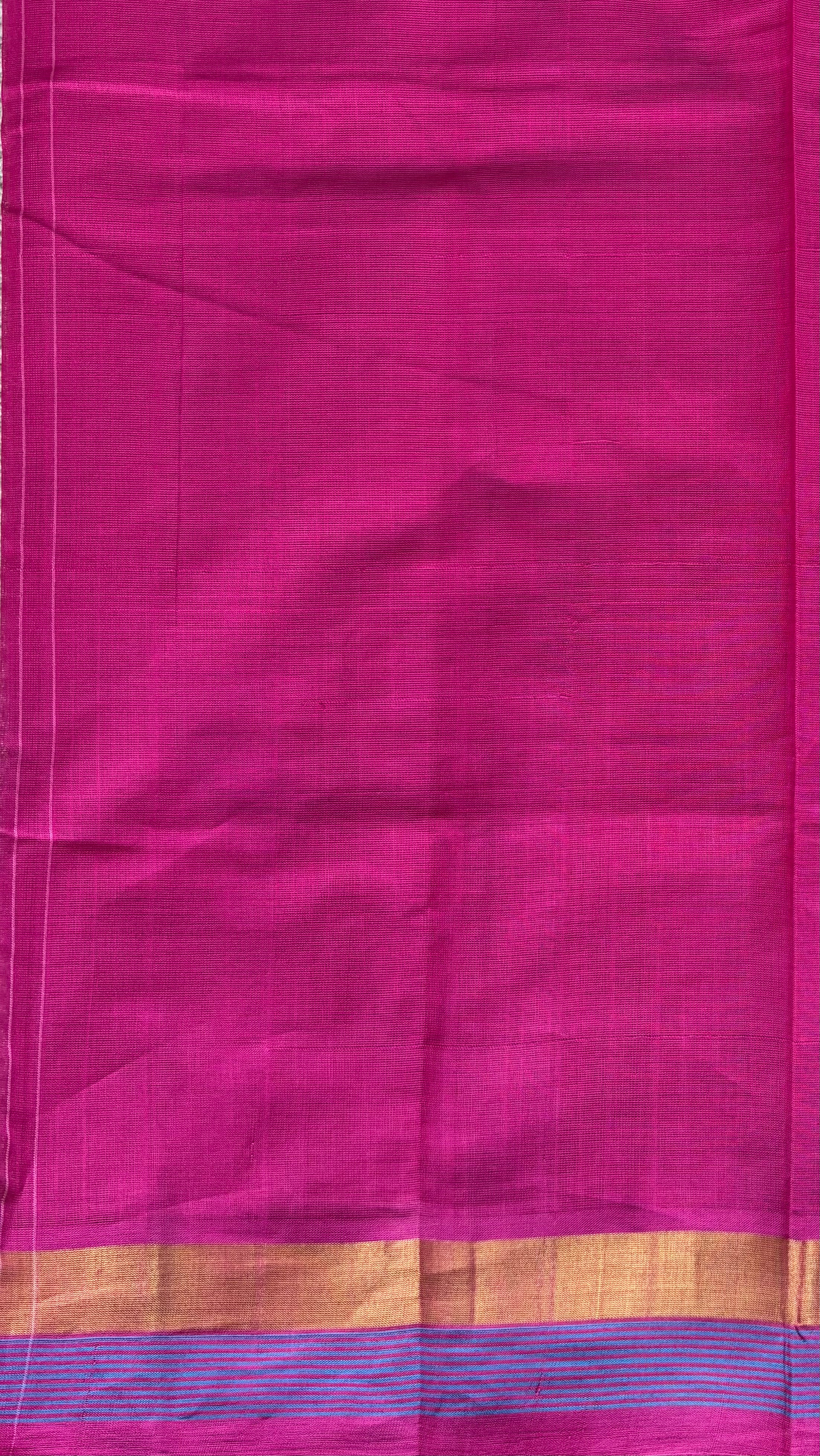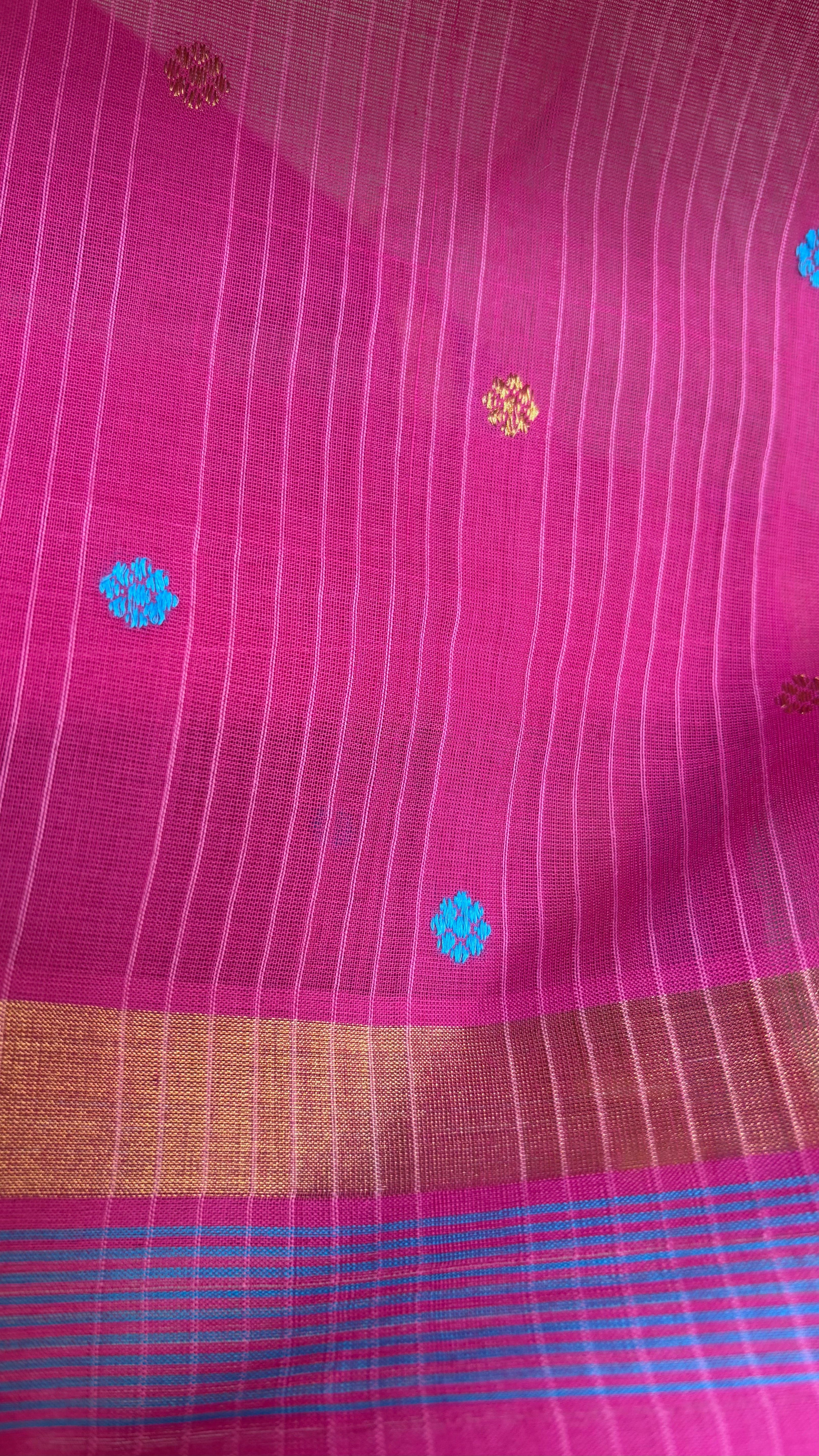 Handwoven cotton Venkatagiri saree in rani pink base saree woven with fine light-pink stripes across the body, highlighted by extra-weft flower motifs in blue and gold scattered rhythmically to create a playful yet elegant contrast.