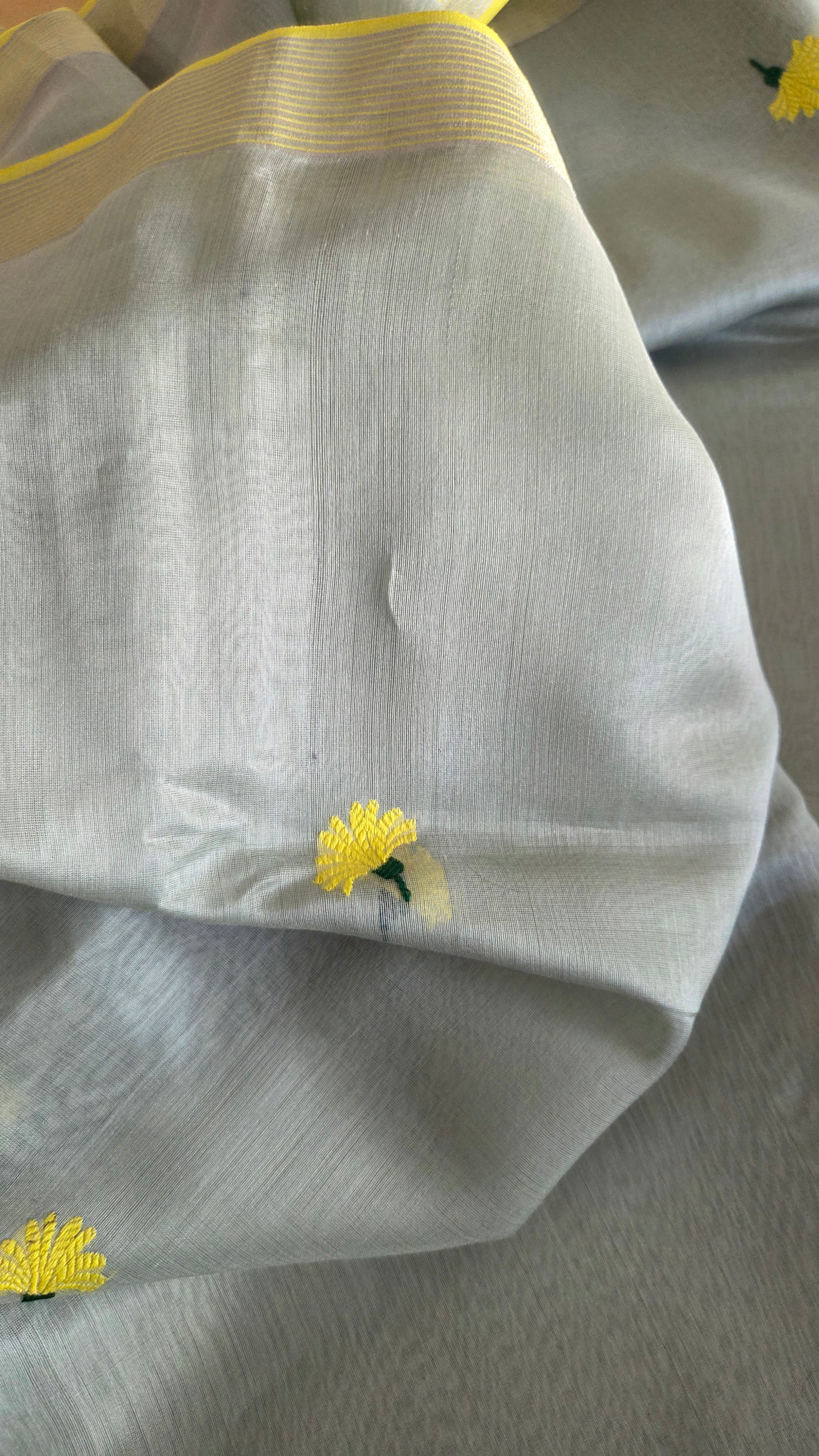 A refreshing Chanderi silk-cotton saree in a light sea foam green shade, where the body is adorned with marigold-inspired extra-weft motifs. Woven in vibrant lemoen yellow and deep forest green, these floral accents provide a contemporary pop of colour against the serene base.