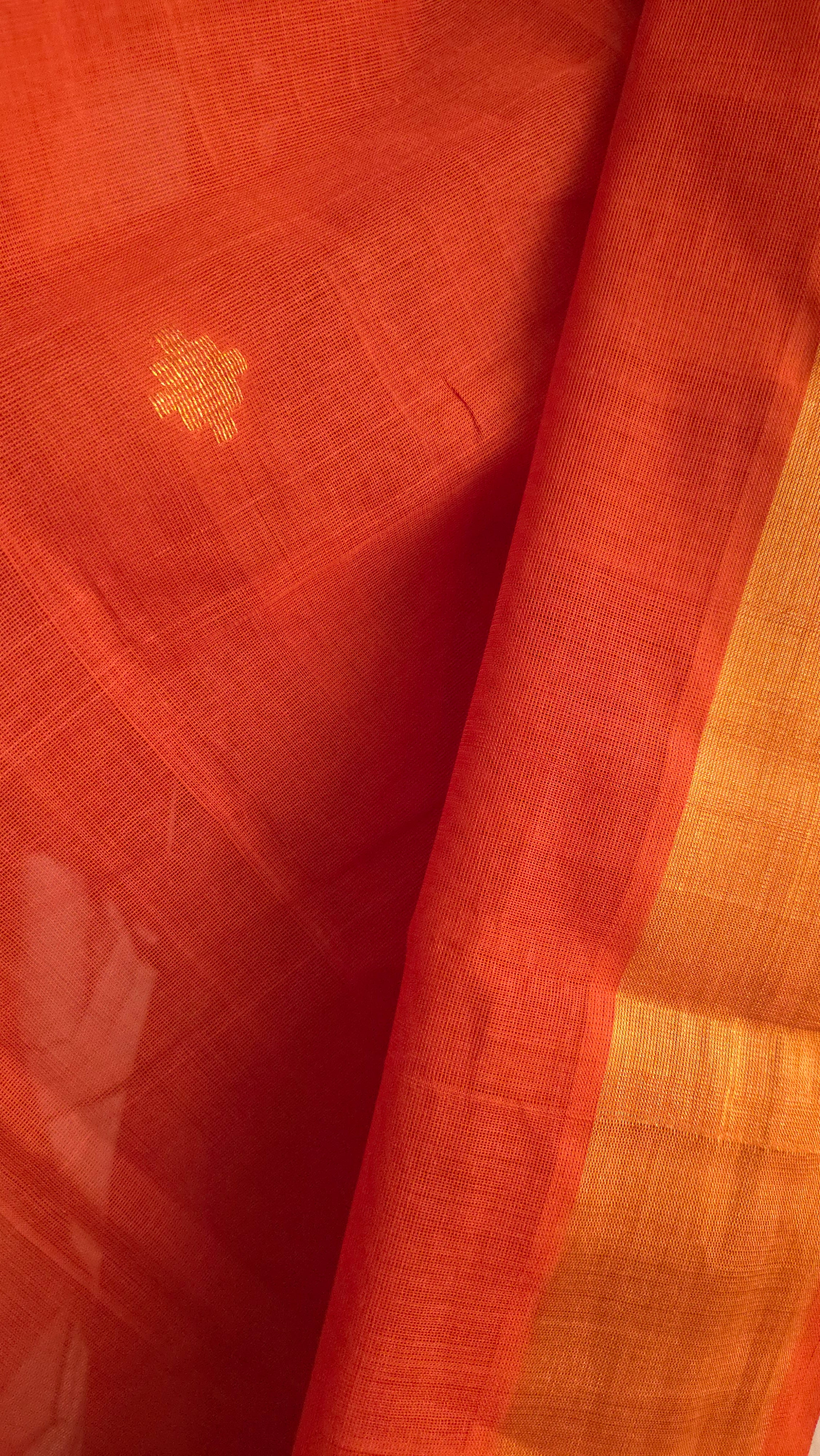 Handwoven Cotton Venkatagiri saree in Rust orange shade with geometric extra-weft diamond motifs woven in gold and silver zari all over the body, giving a rich shimmer and structured elegance.