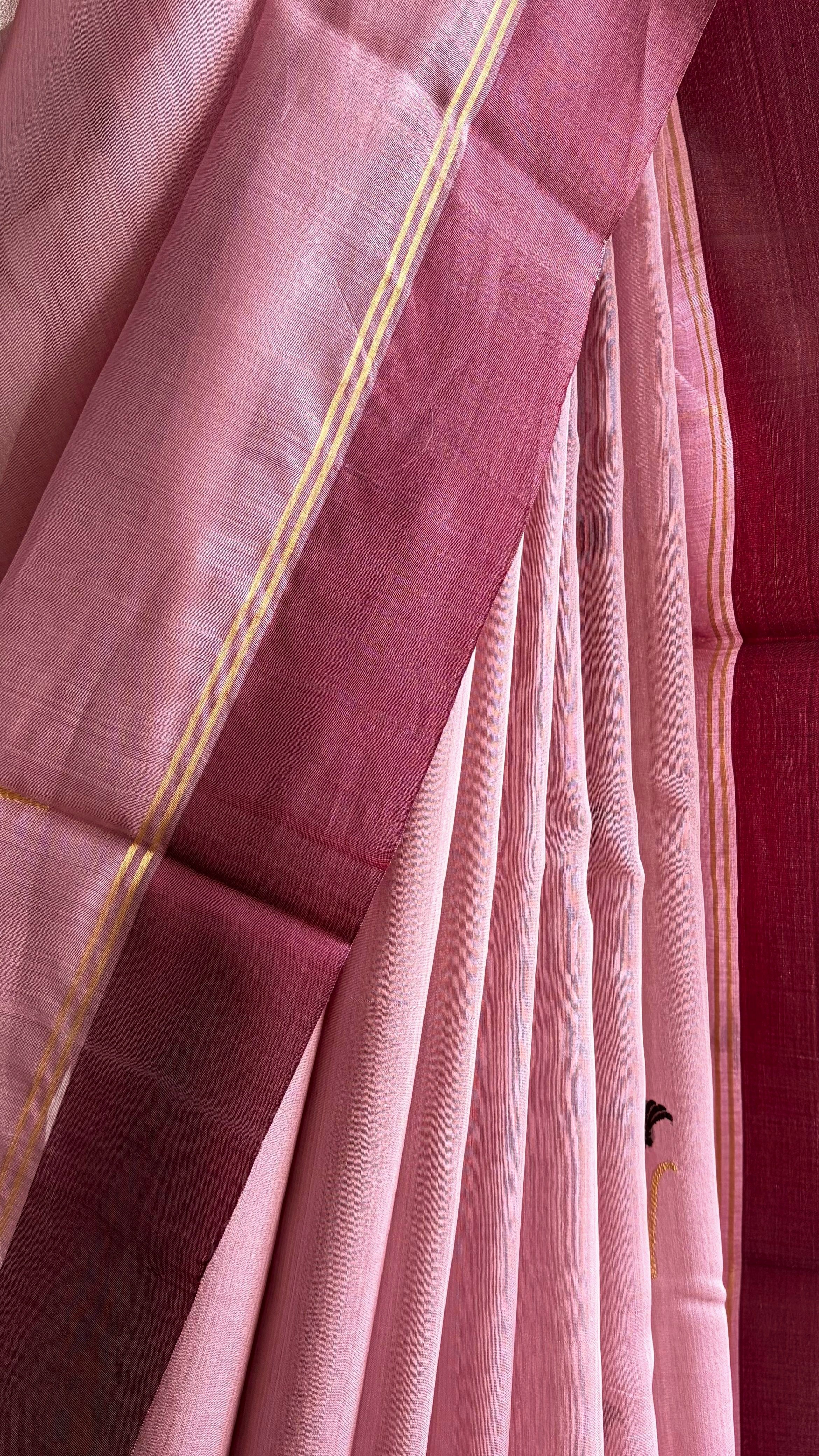 The pallu is finished with subtle gold zari pinstripes, keeping the look refined.