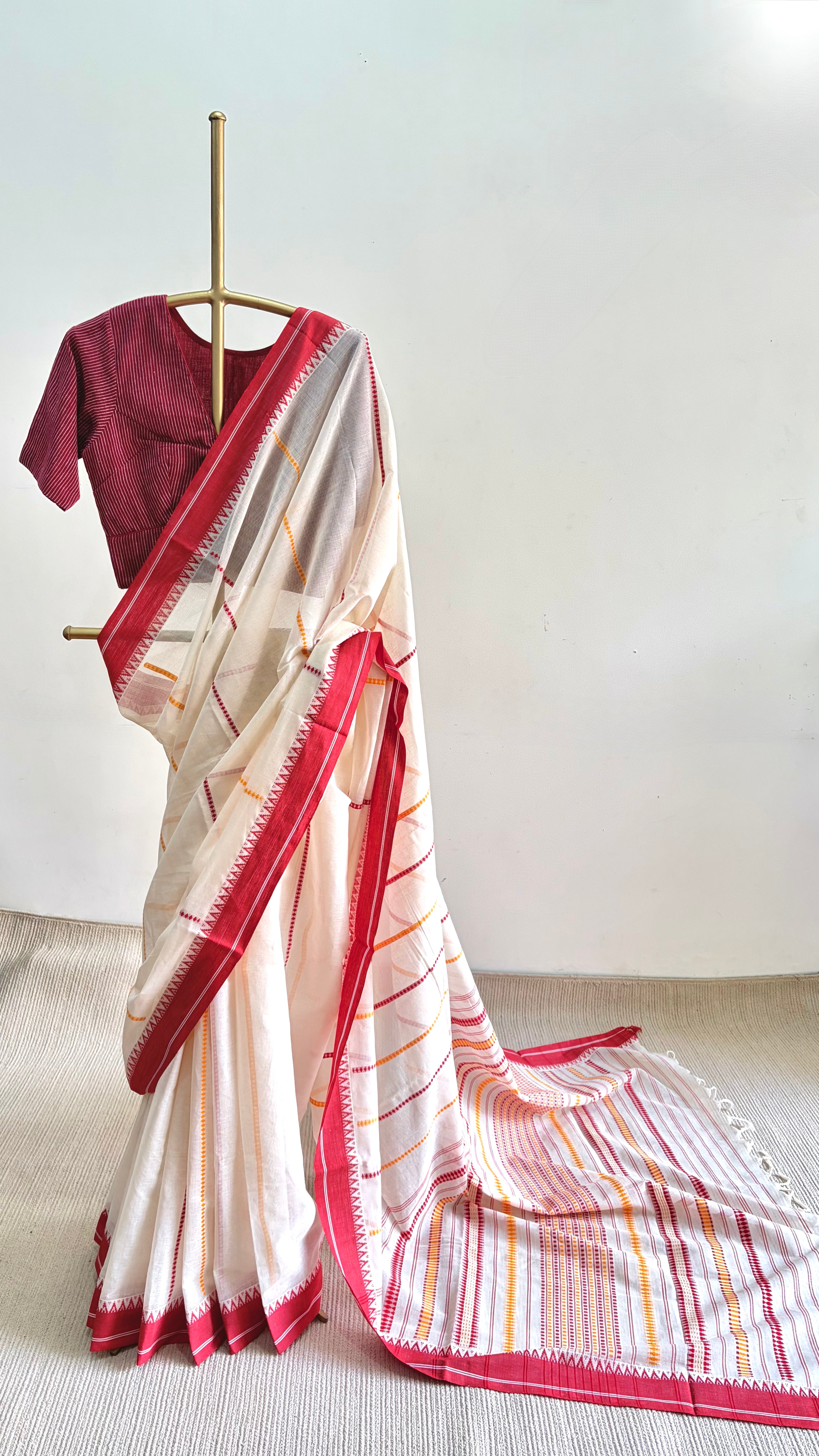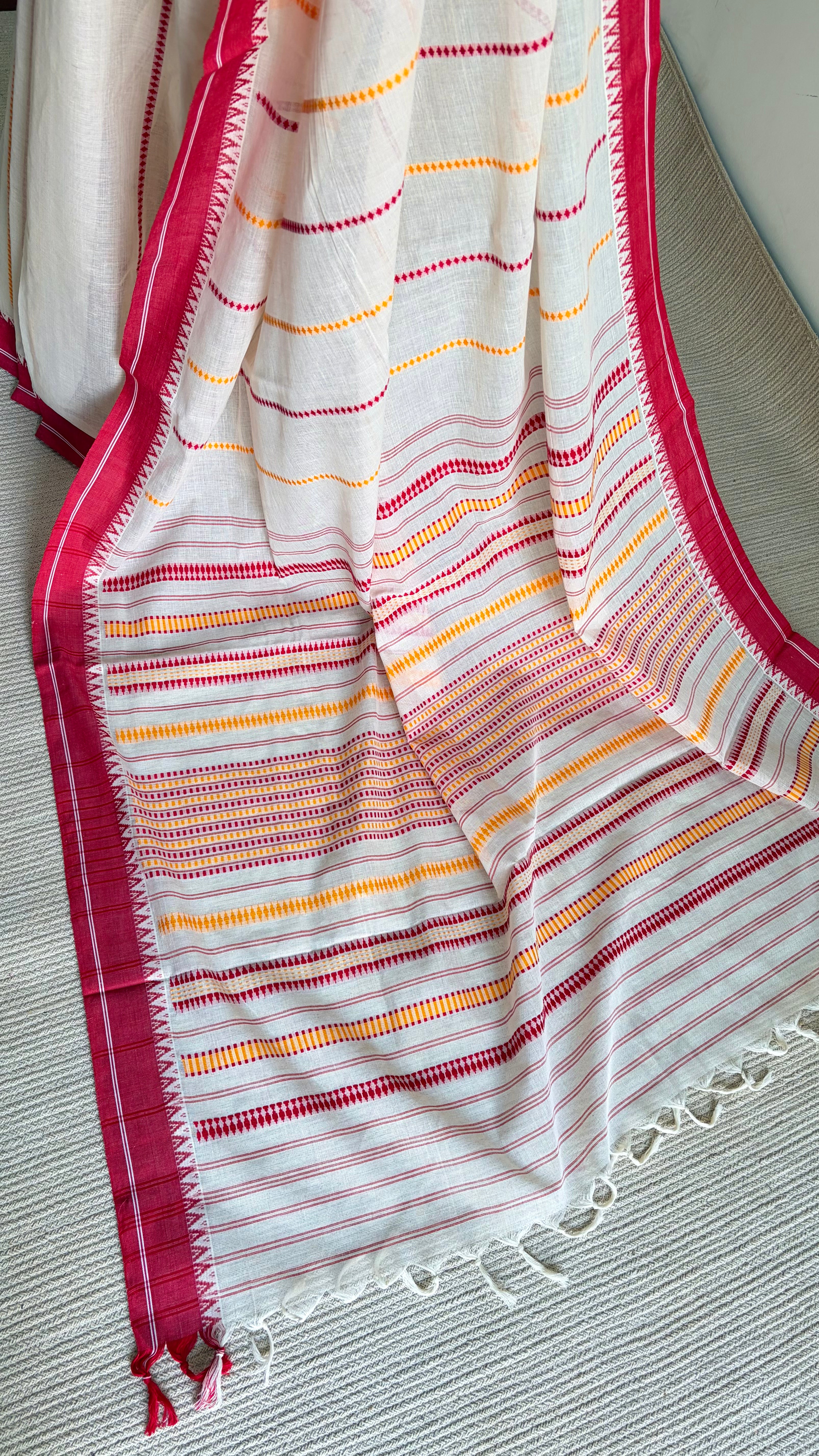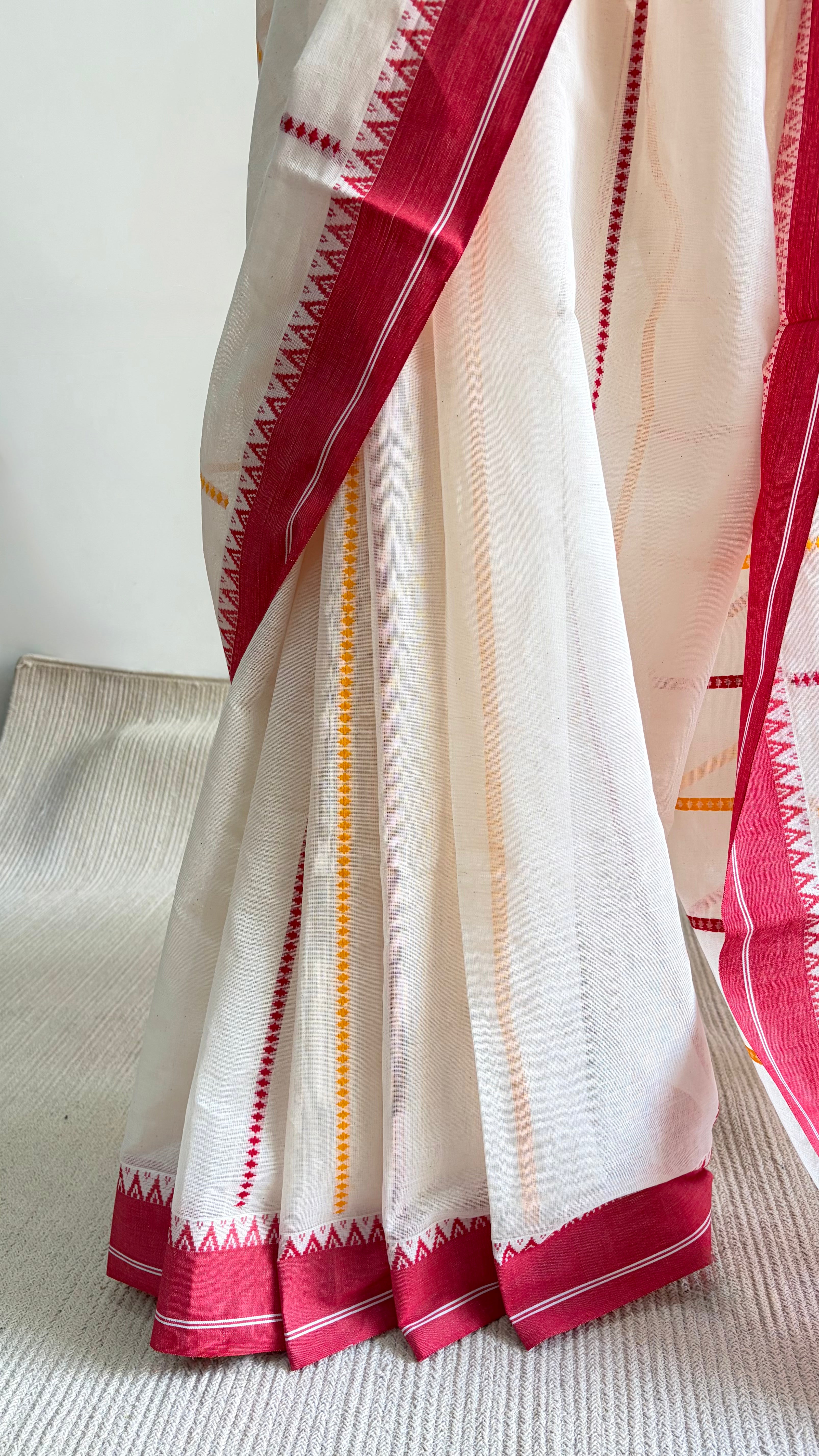 Handwoven Begumpuri saree in off-white base with vertical extra-weft stripes running across the body, forming subtle diamond motifs. The alternating yellow and red stripes add rhythm and character.