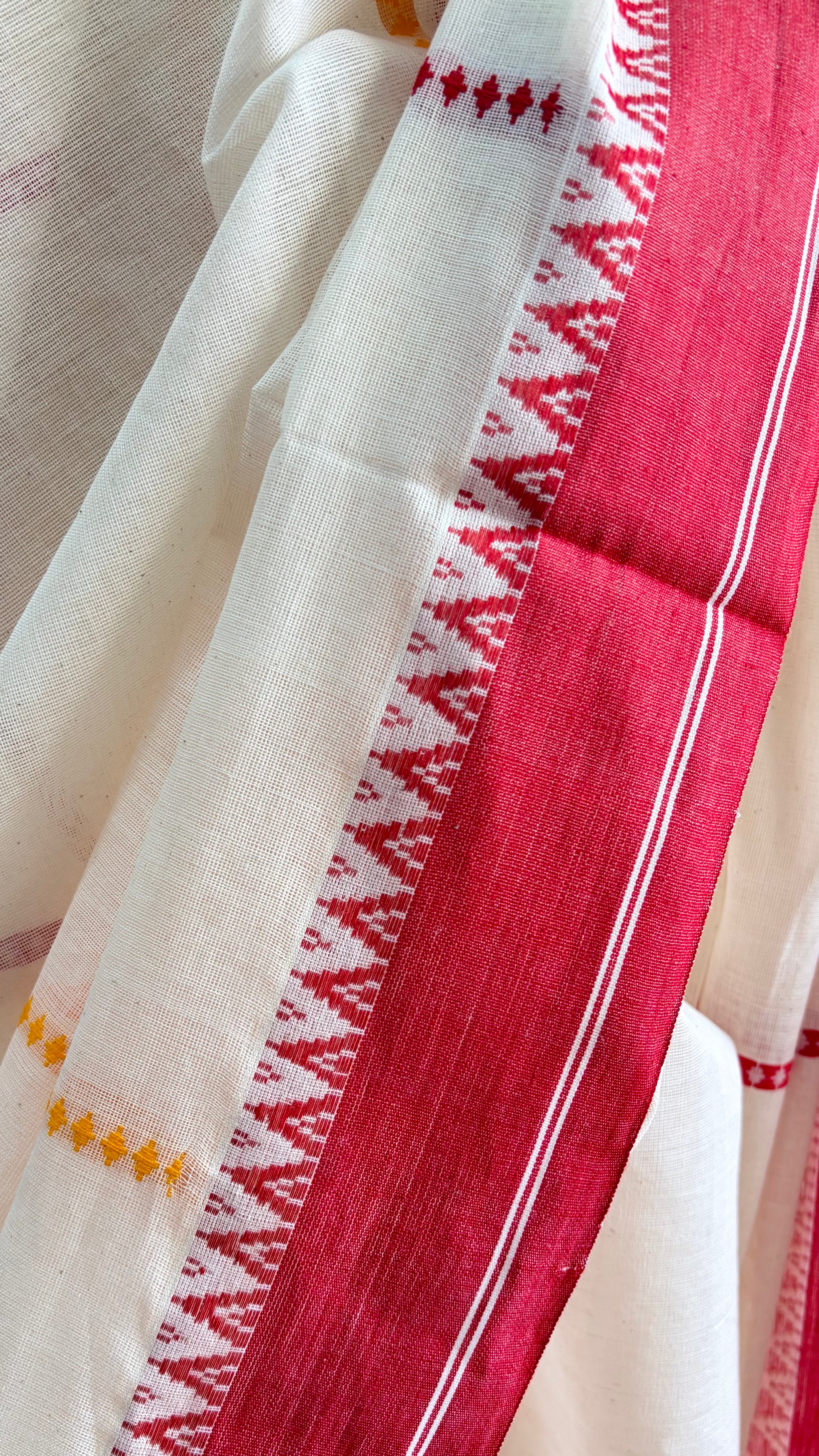 The pallu features geometric extra-weft motifs in yellow and red, along with red stripes, creating a striking and balanced look. Perfect to wear for: poojas, morning events, outings in the park.