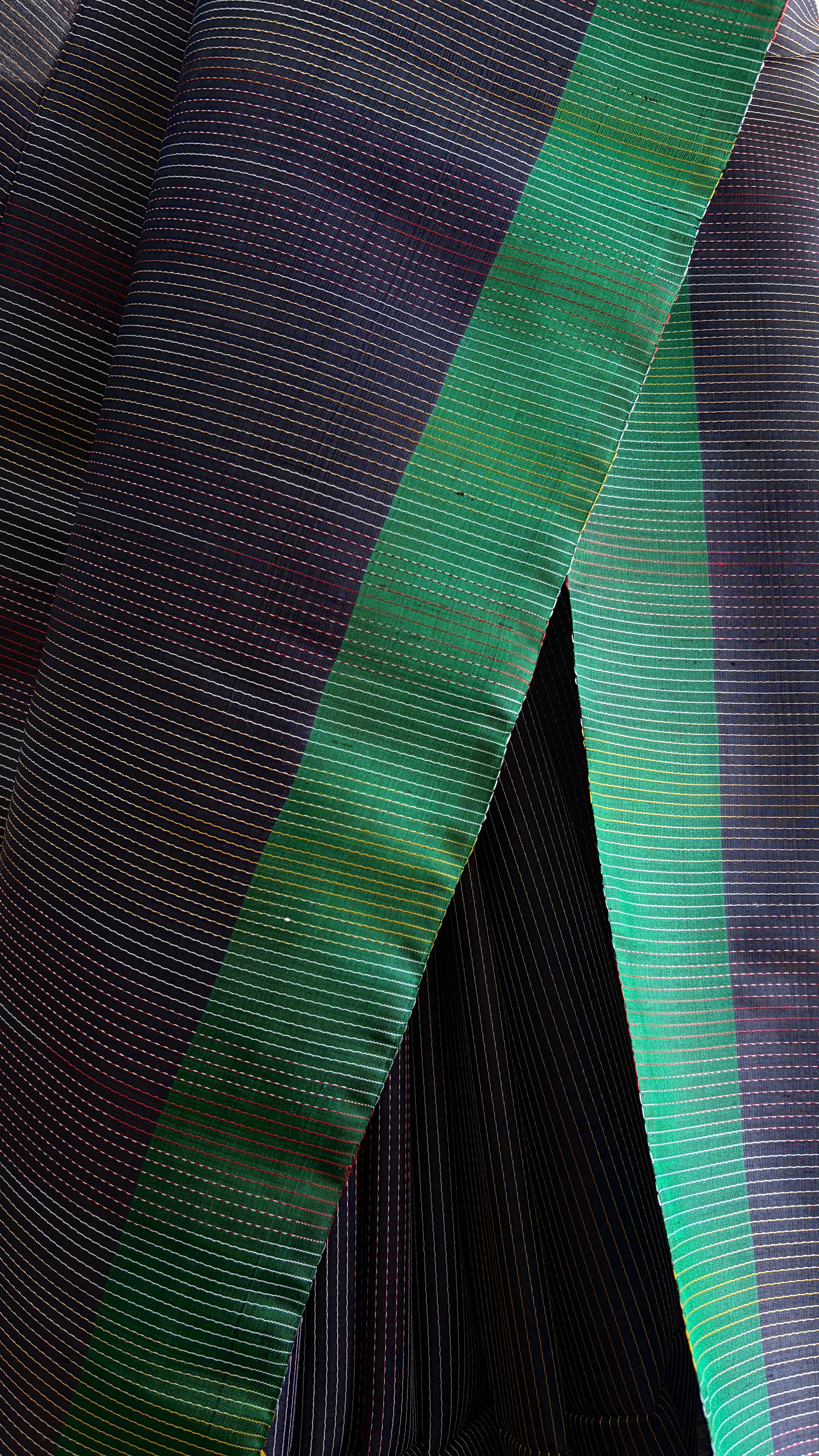 Lustrous, airy, and regal, this interwoven extra-weft saree reflects the quiet richness of handwoven craftsmanship. The speciality of the saree lies in its additional weft yarns that create subtle geometric patterns across the body. Woven in a deep midnight blue shade, the body features extra-weft stripes in white, yellow, and red, forming linear details that add texture and lend the saree a refined geometric visual.