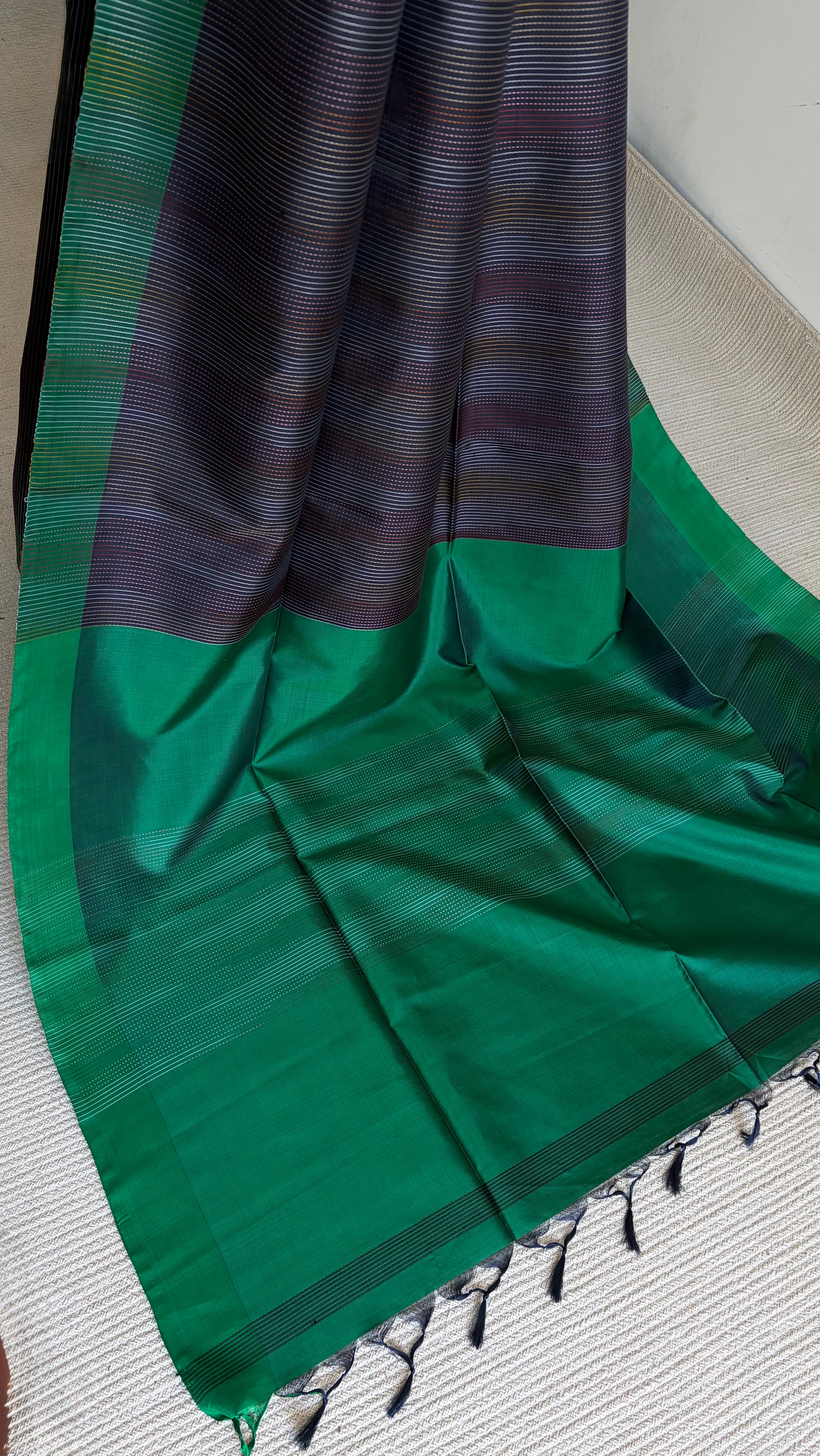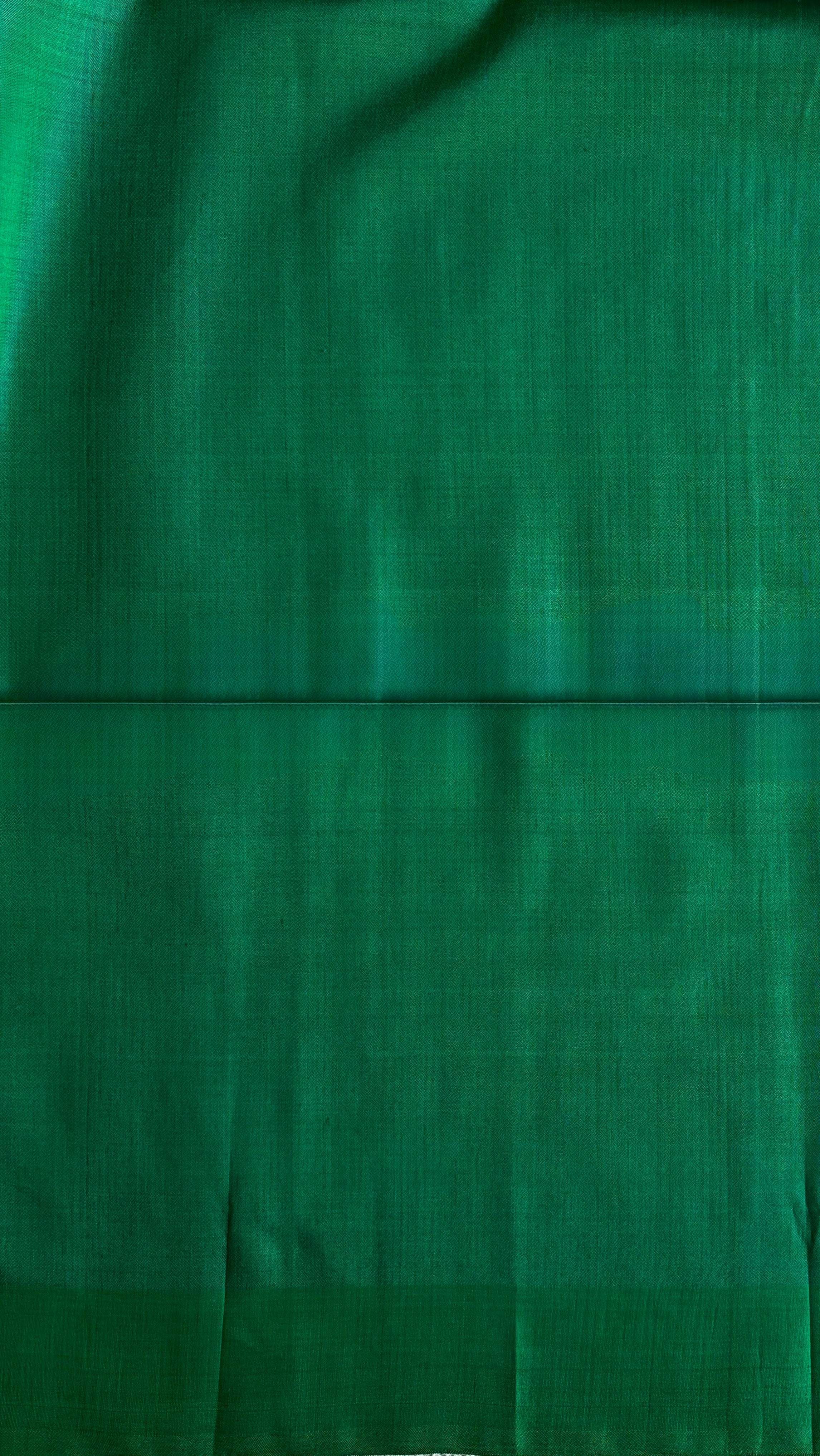 The saree is finished with a forest green border that carries forward the extra-weft detailing, adding depth and contrast while framing the body elegantly without overpowering the weave.