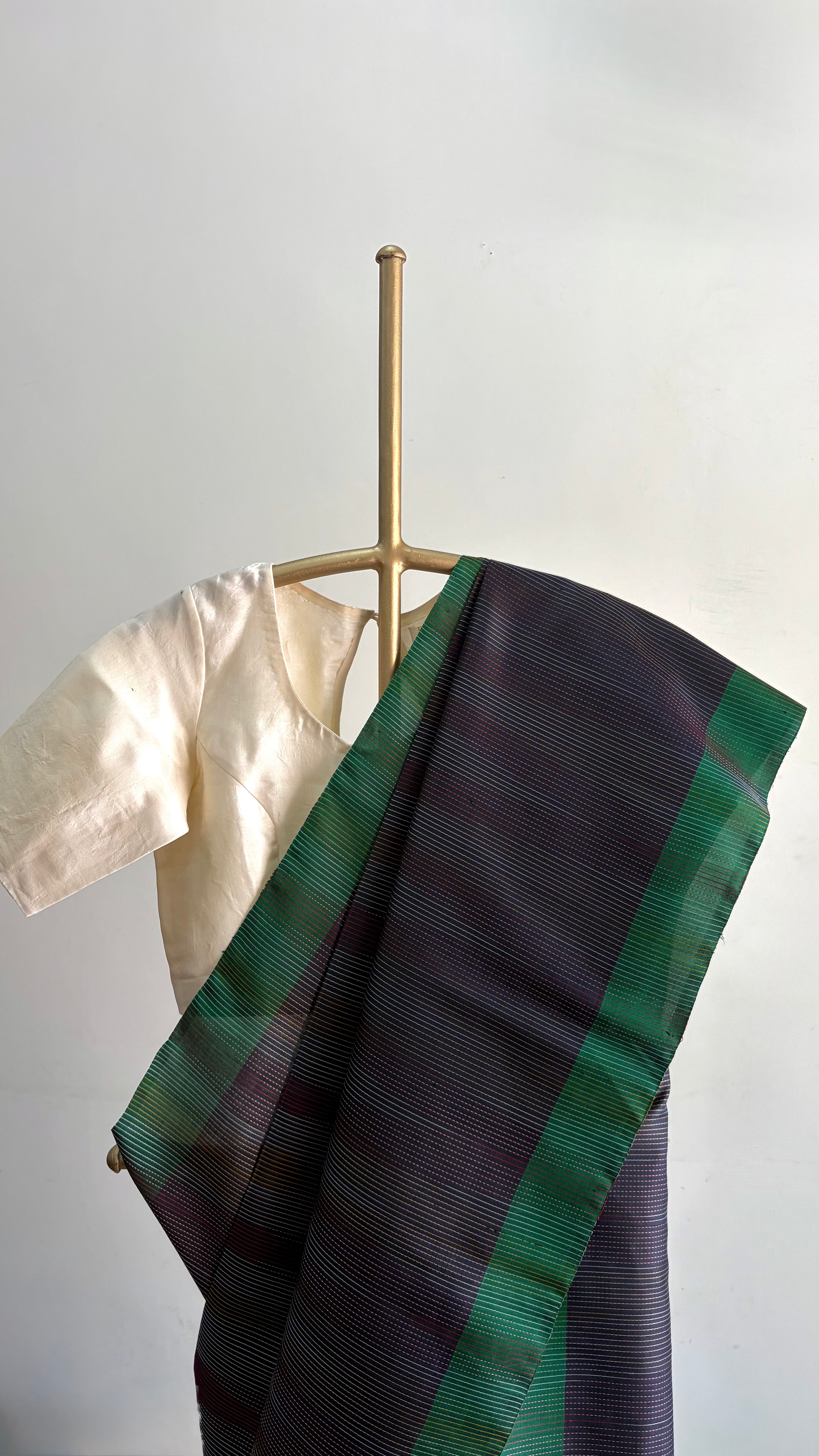 The pallu comes in a forest green shade and is kept plain and simple, highlighted with bands of extra-weft placed through the centre for a clean and balanced finish.