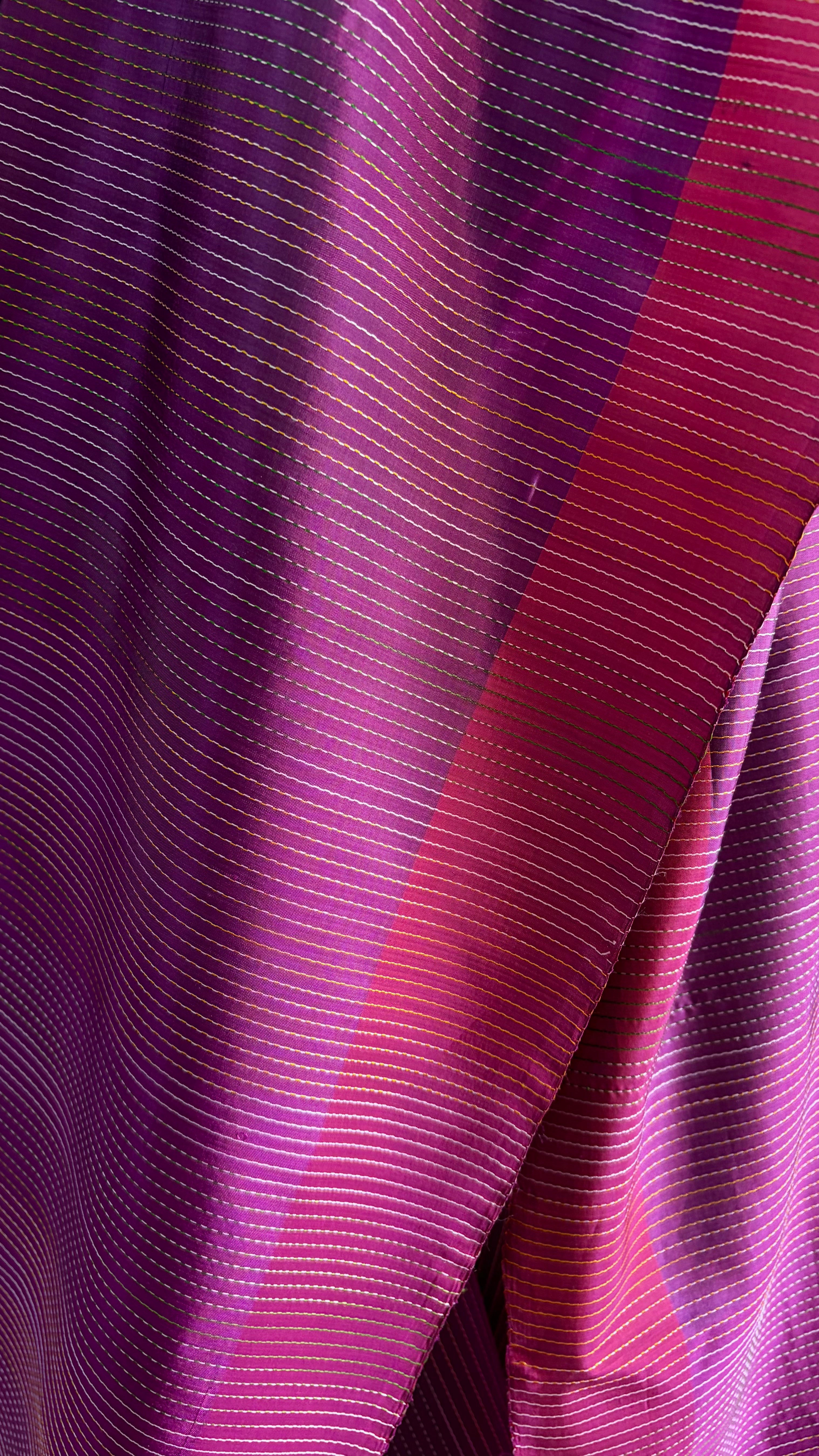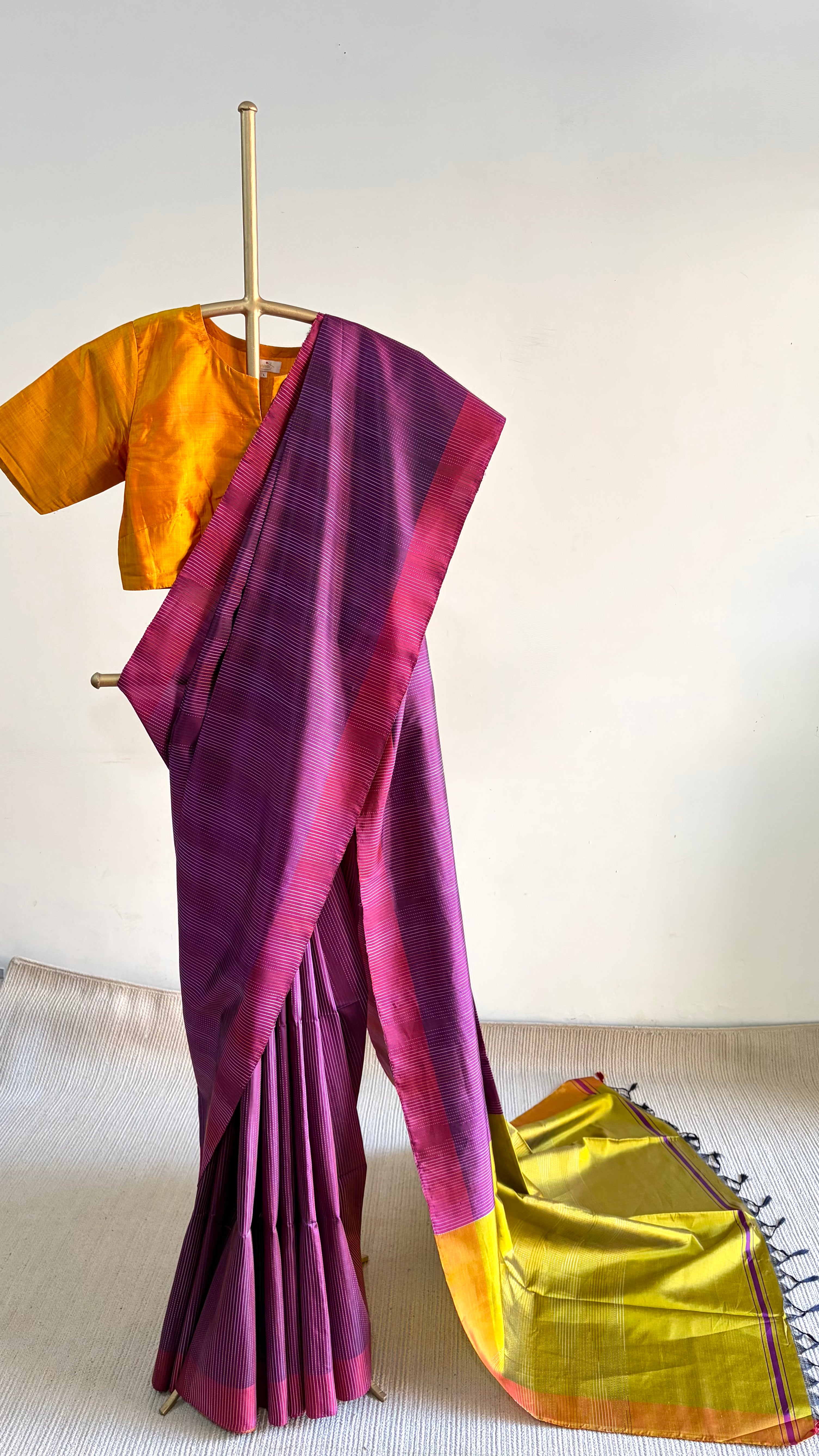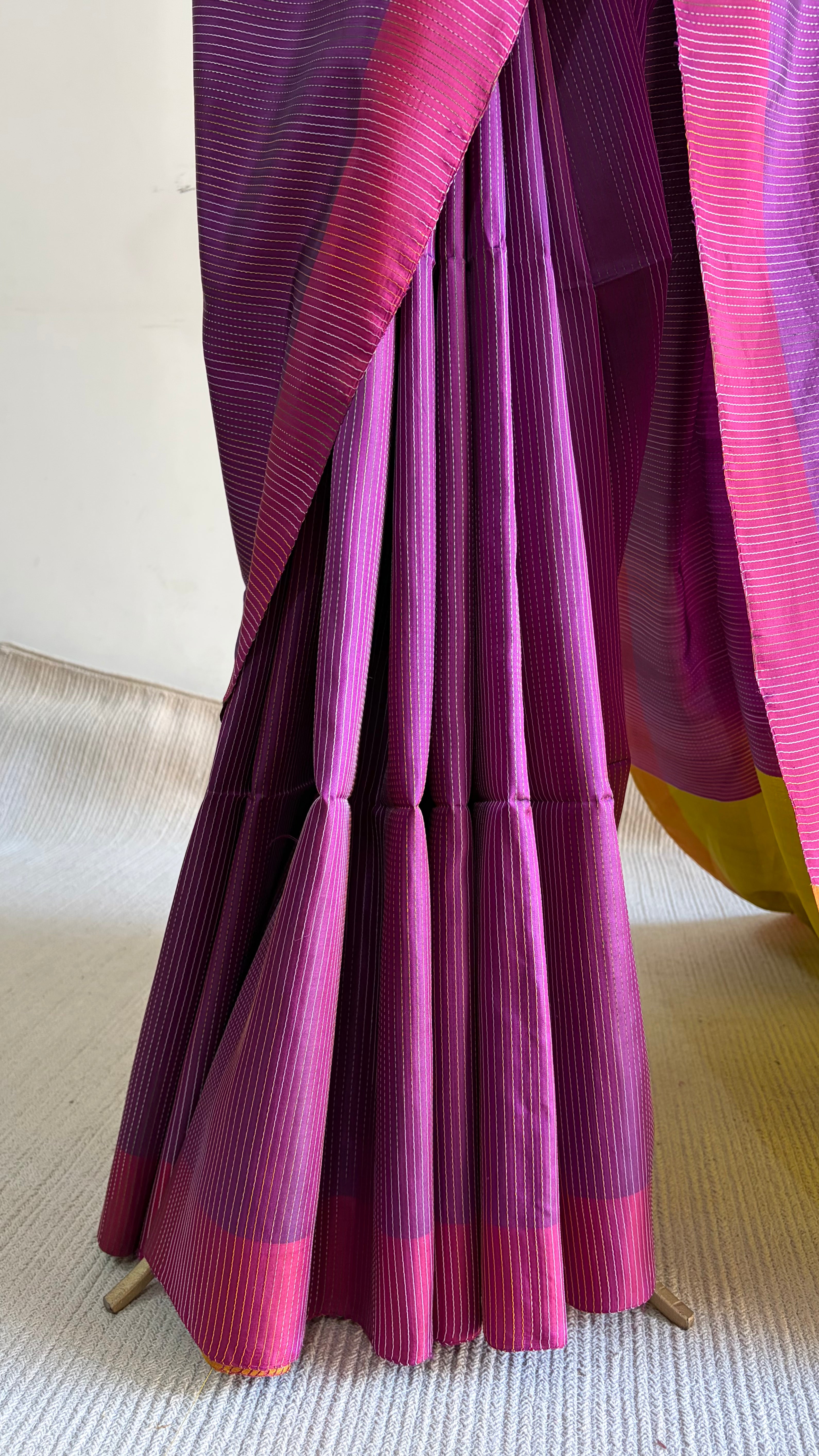 Lustrous, airy, and regal, this interwoven extra-weft saree showcases the finesse of handwoven craftsmanship. The speciality of the saree lies in its additional weft yarns that create subtle geometric patterns across the body. Woven in a rich purple shade, the body features extra-weft stripes in white, yellow, and green, forming linear details that add texture and lend the saree a refined geometric visual.