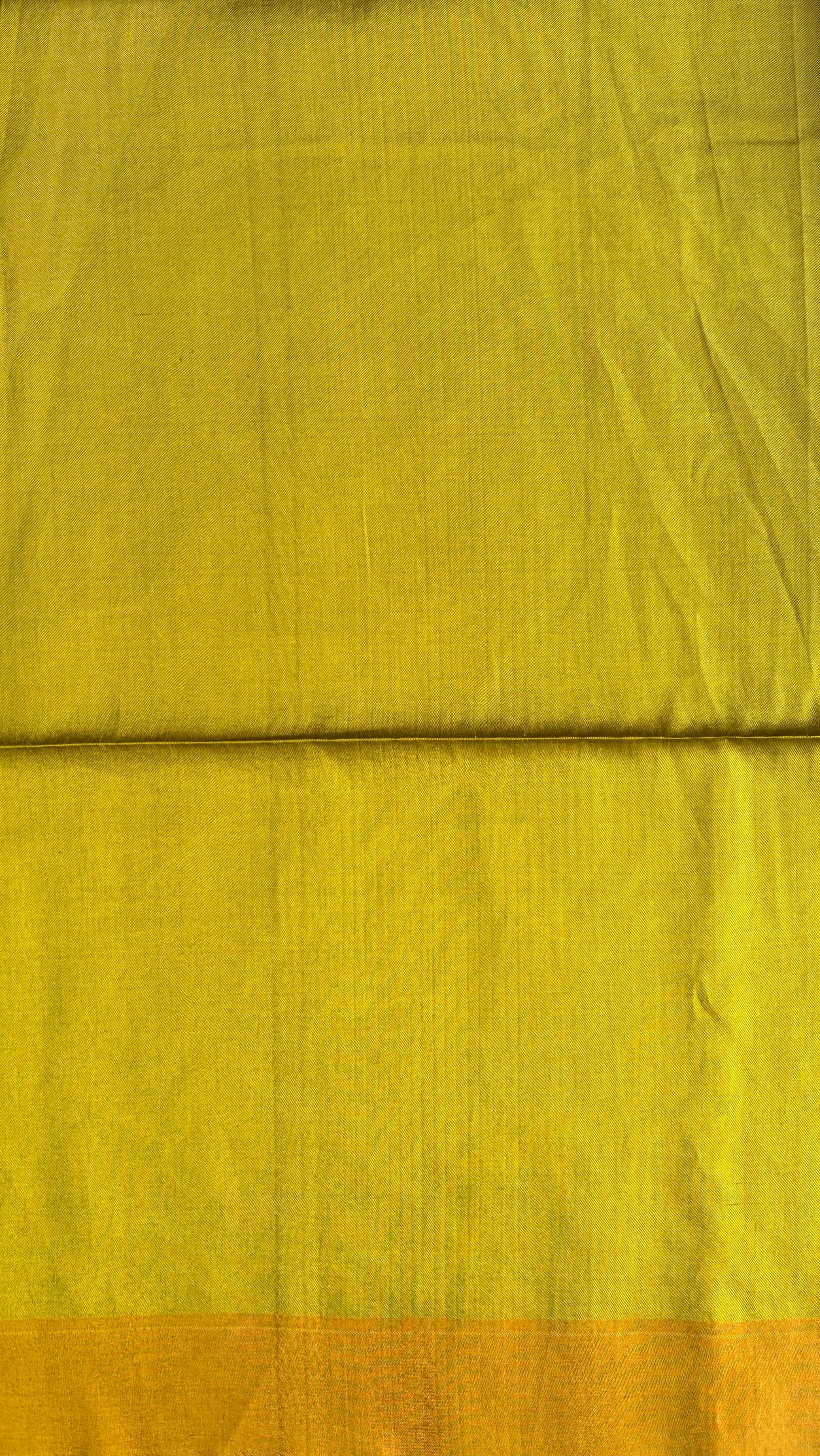 The pallu comes in a lime shade and is kept plain and simple, highlighted with bands of extra-weft placed through the centre for a clean and balanced finish.