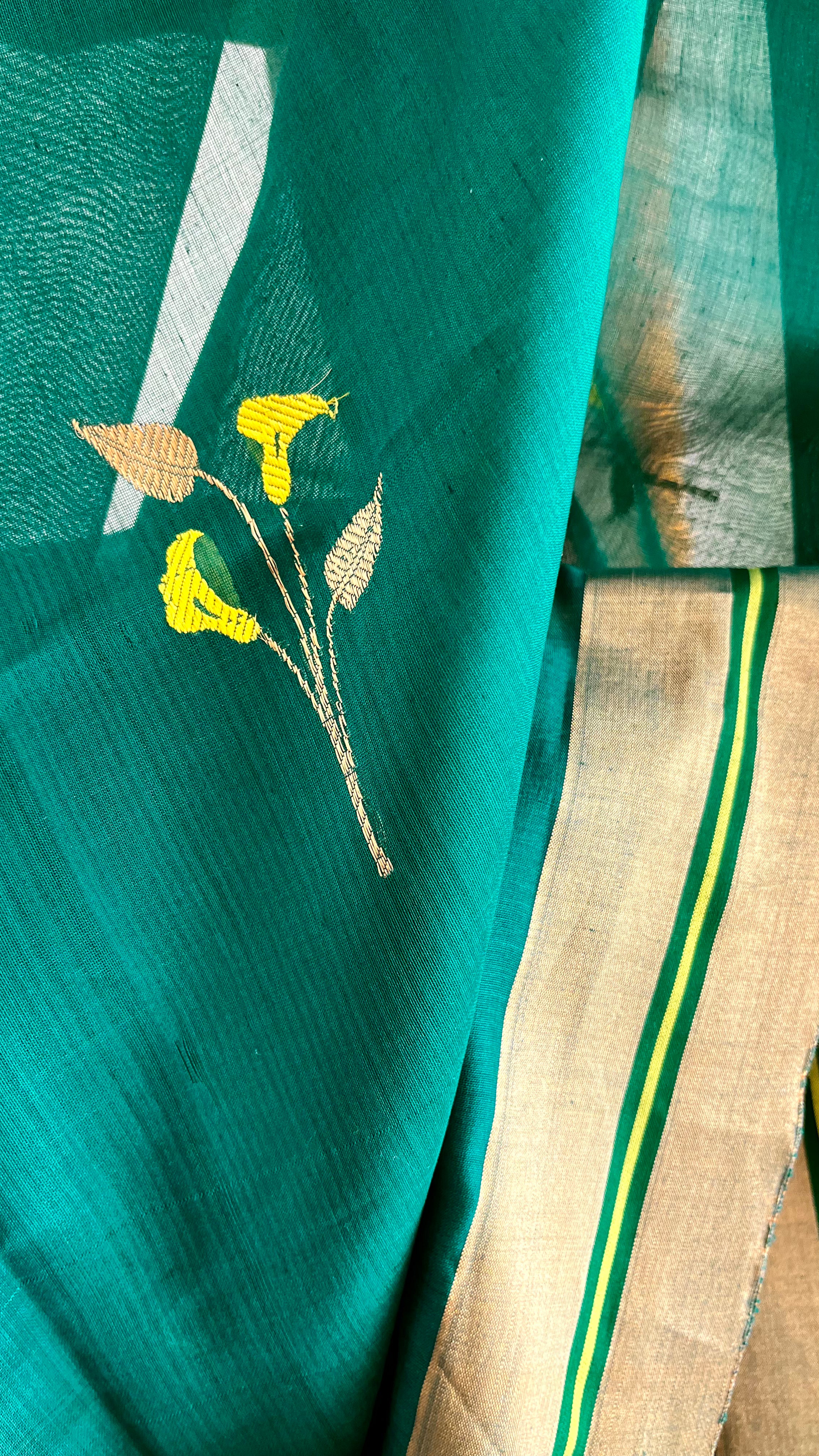 The body of this handwoven silk Chanderi saree is crafted in a rich dark teal shade, featuring motifs inspired by calla lilies. The design incorporates gold zari stalks and leaves, along with handwoven flowers in lime yellow that harmonize beautifully with the border.