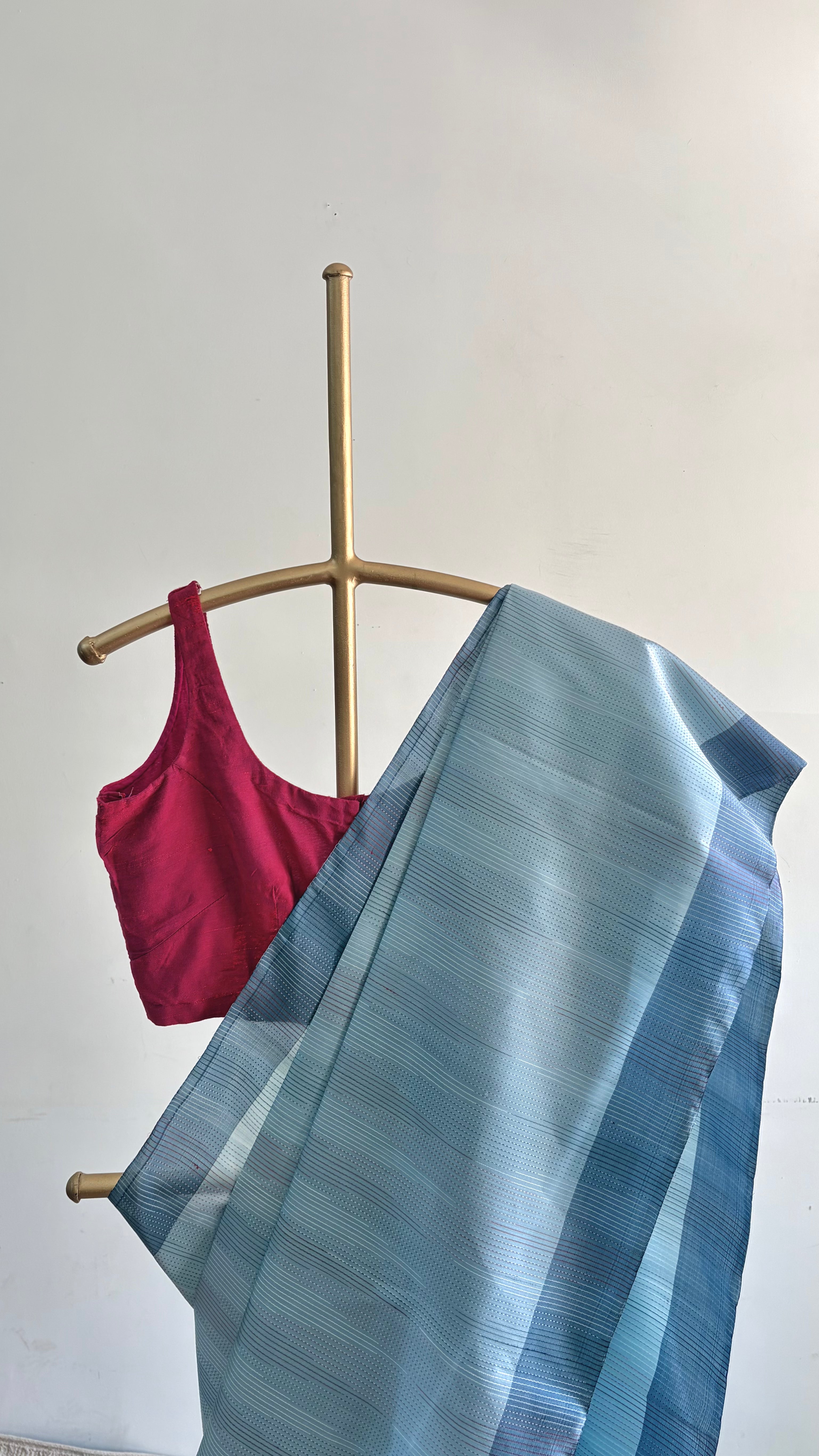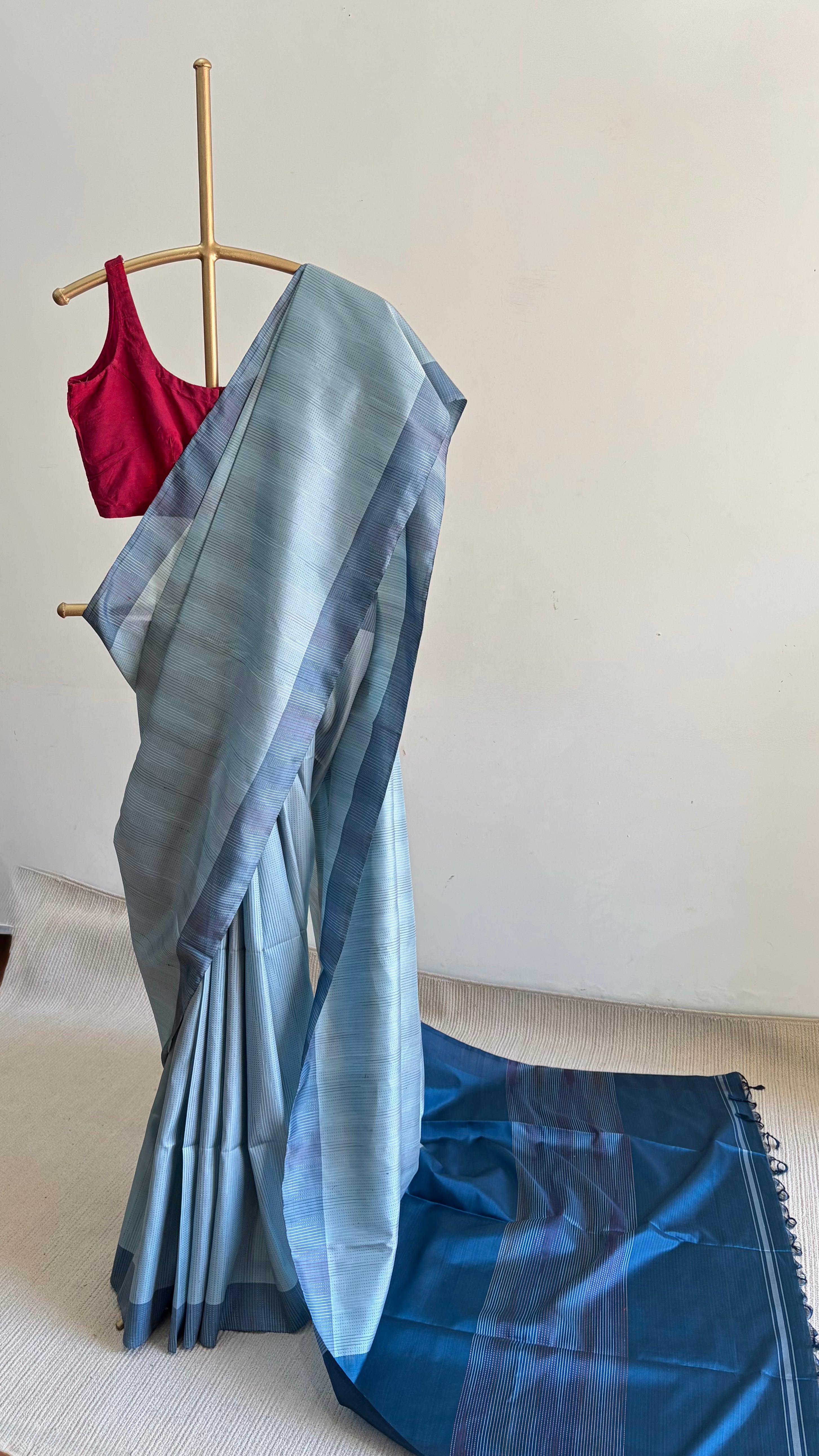 Lustrous, airy, and regal mulberry silk saree handwoven in the hinterlands of Bengal. The speciality of this saree lies in the additional weft yarns that create various geometric patterns on the body. This saree comes in a subtle light blue shade with extra-weft stripes woven in white, red, and blue, creating linear details that add rich texture and lend the saree a subtle geometric visual.