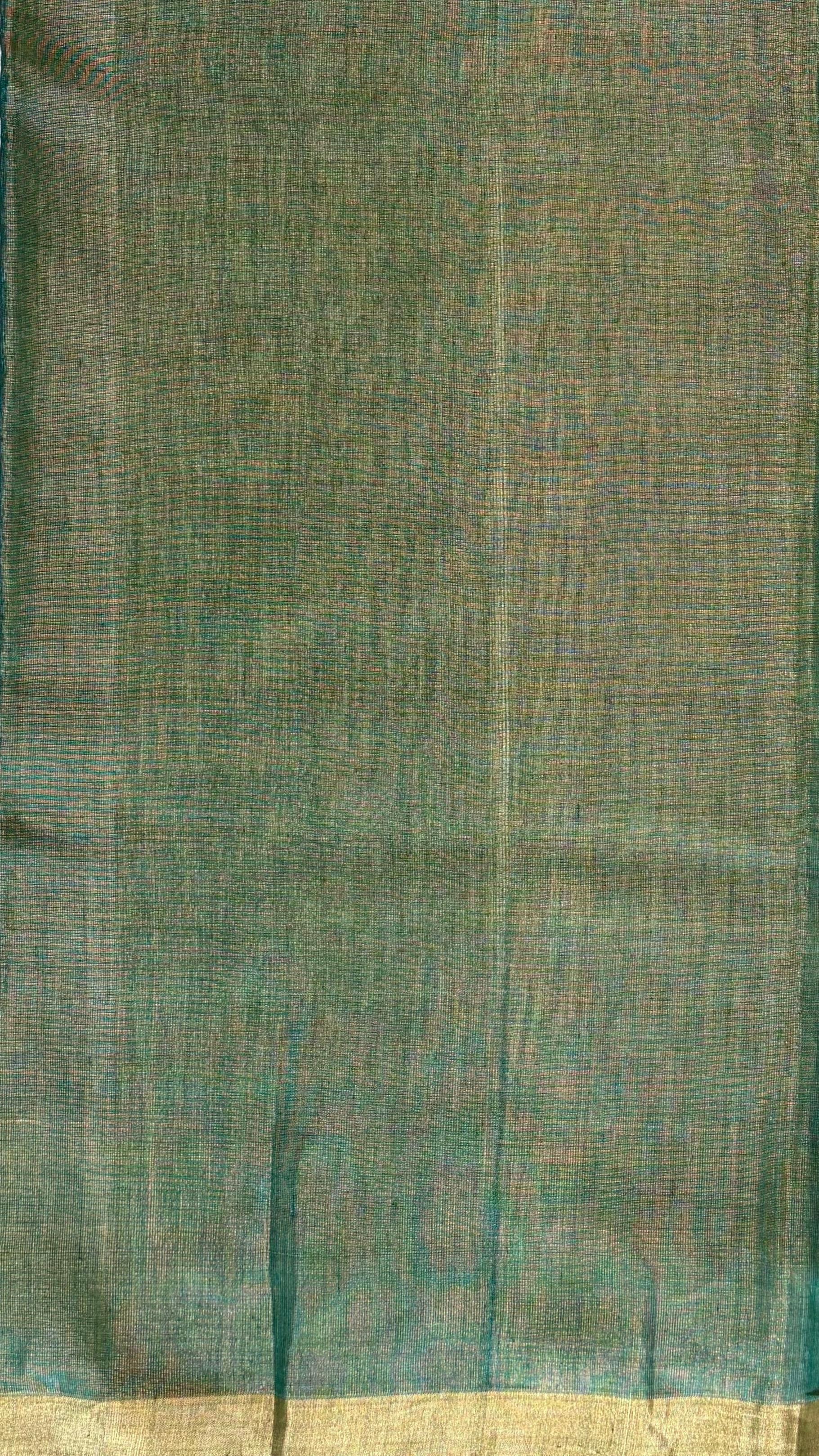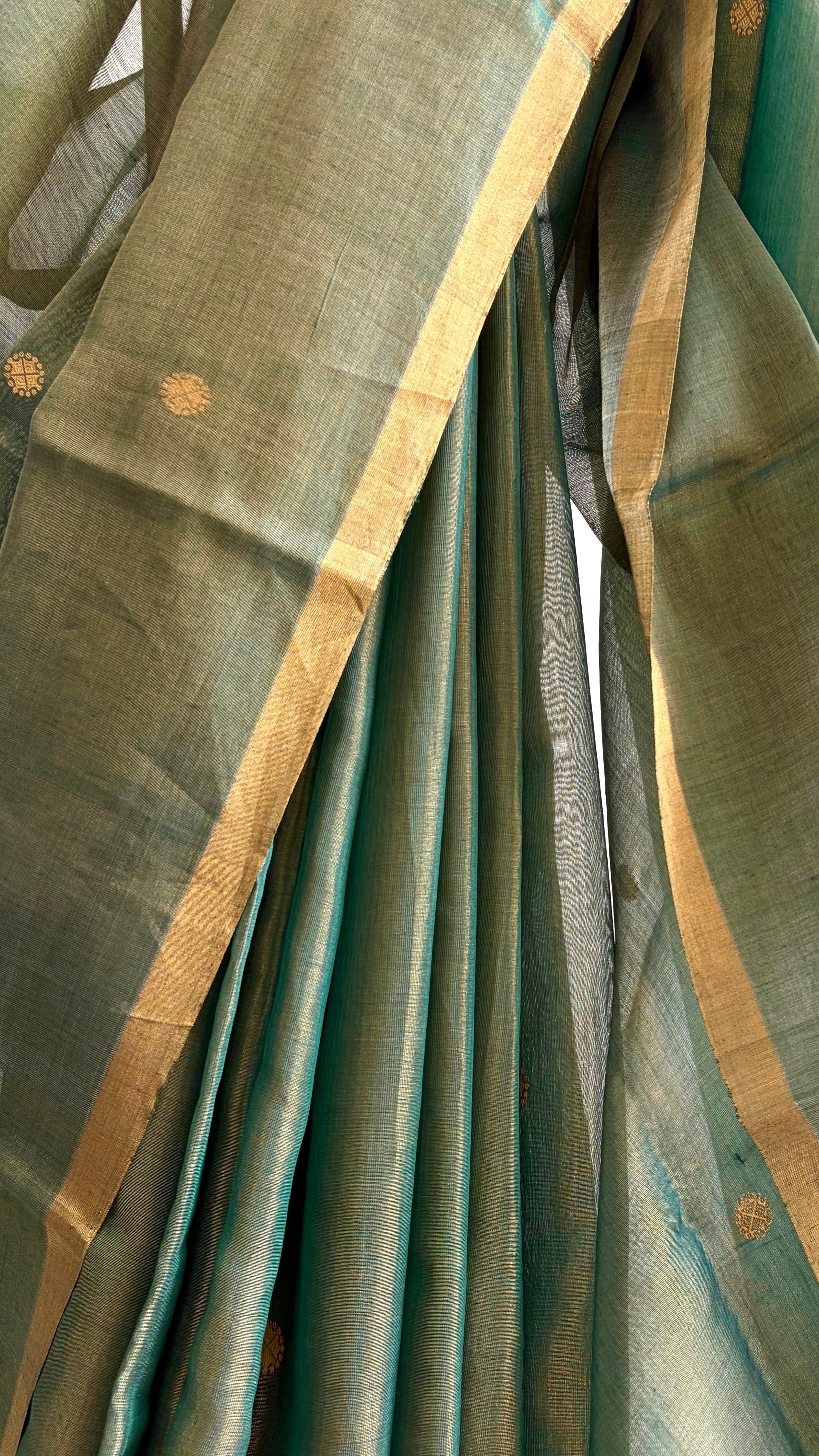 A luminous Chanderi silk-cotton tissue saree in a rich dual tone of tulsi green and gold, where the body is adorned with delicate floral gold zari buttas woven all over, lending a festive glow and refined texture.