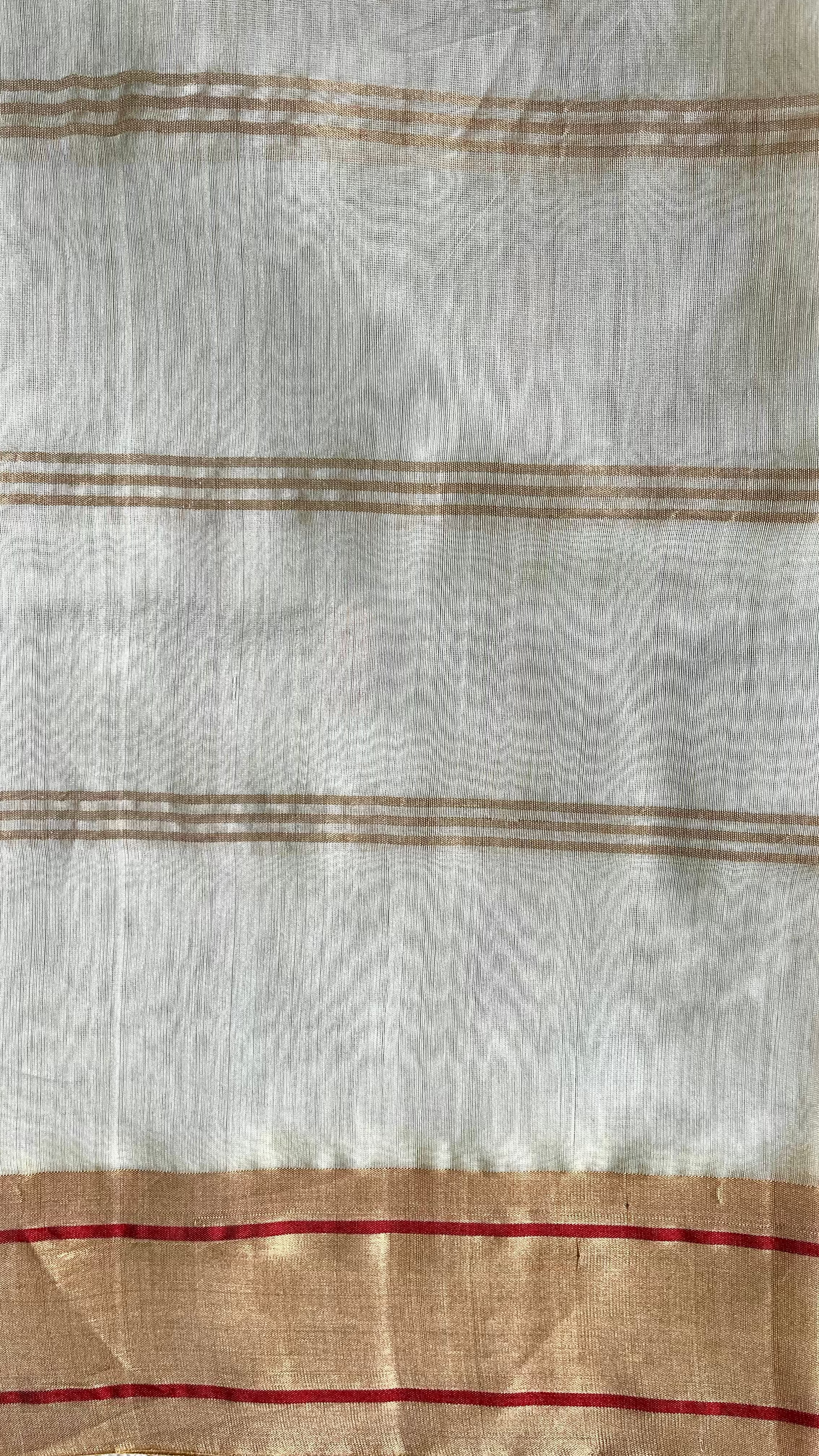 The border is designed with a band of gold zari that also consists of two thin red stripes, giving it a refined and balanced finish.