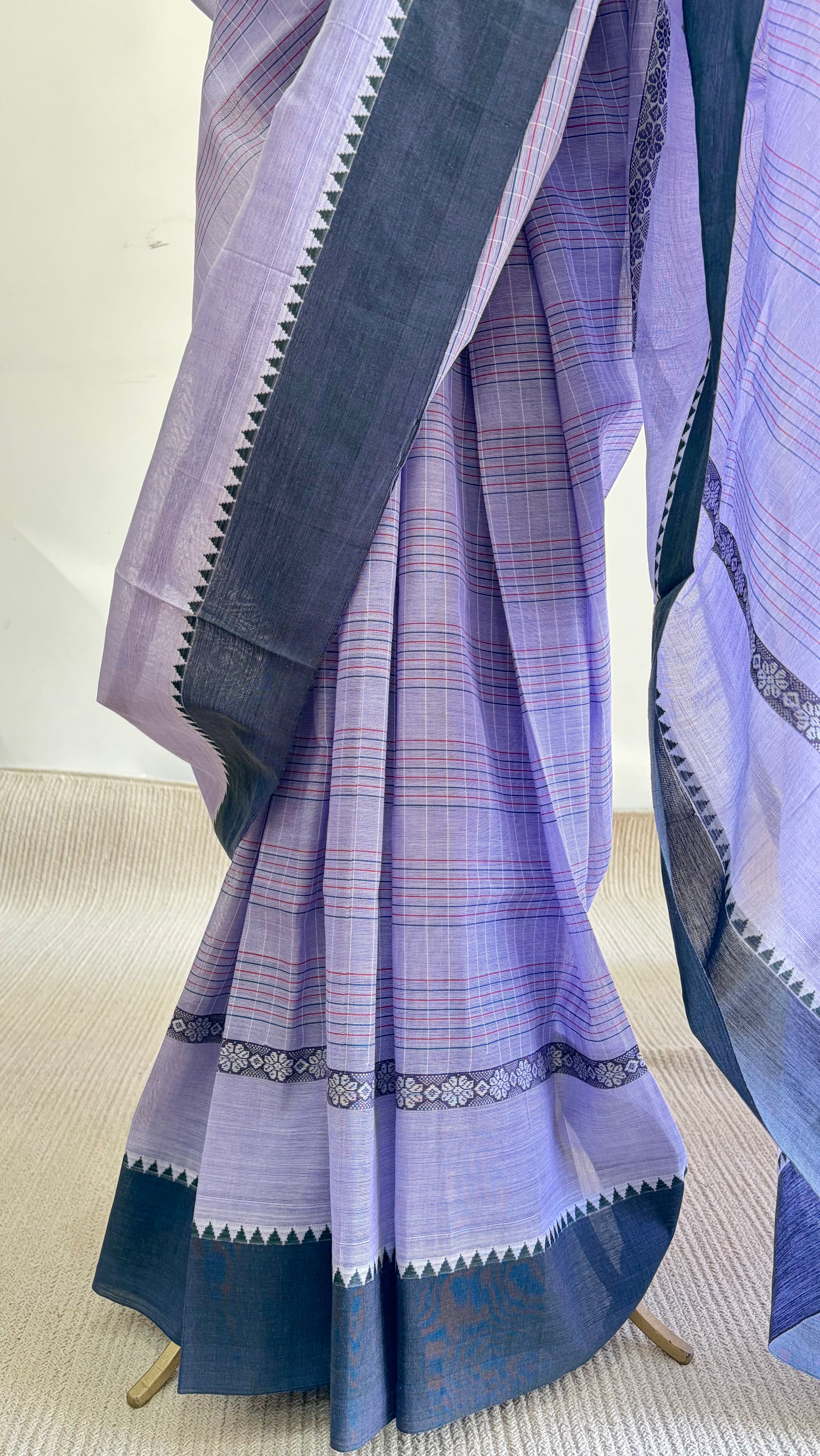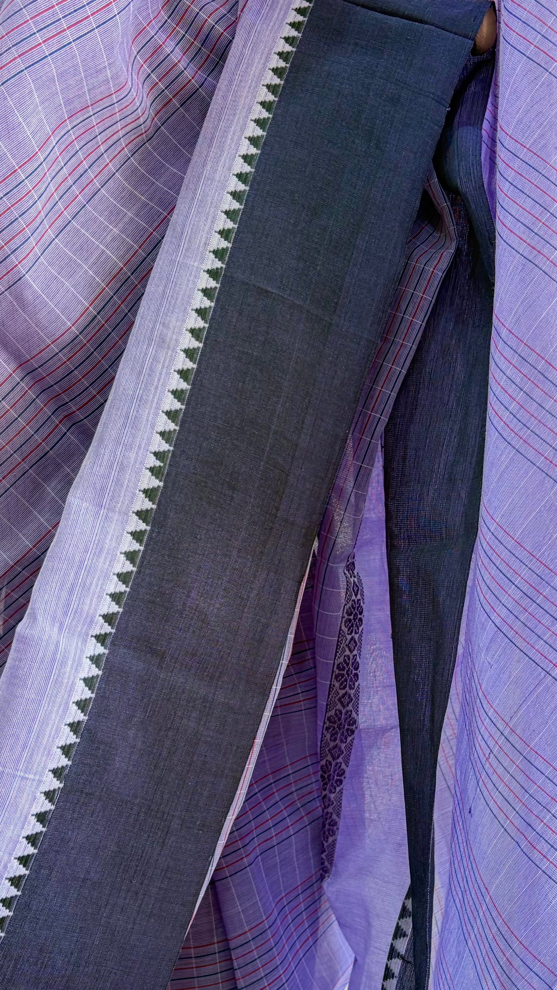 The saree is finished with a double border in a band of dark purple-grey and a band of the base colour, accented with a strip of dobby flower motifs in white for a delicate and traditional touch.