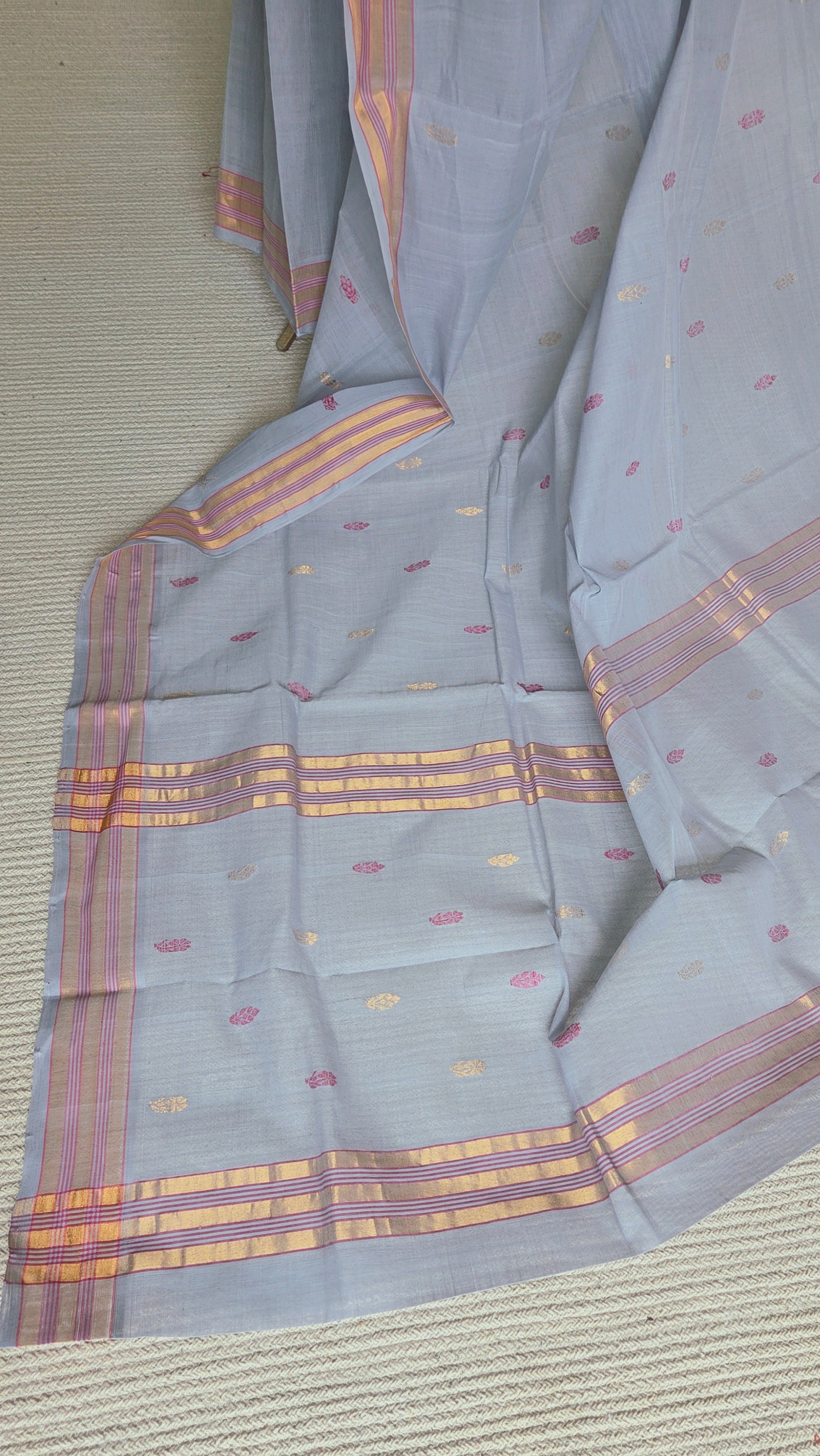 Handwoven cotton Venkatagiri saree in Light grey base with extra-weft sapling buttas woven in zari and rani pink, adding delicate shimmer and a subtle floral motif across the body.