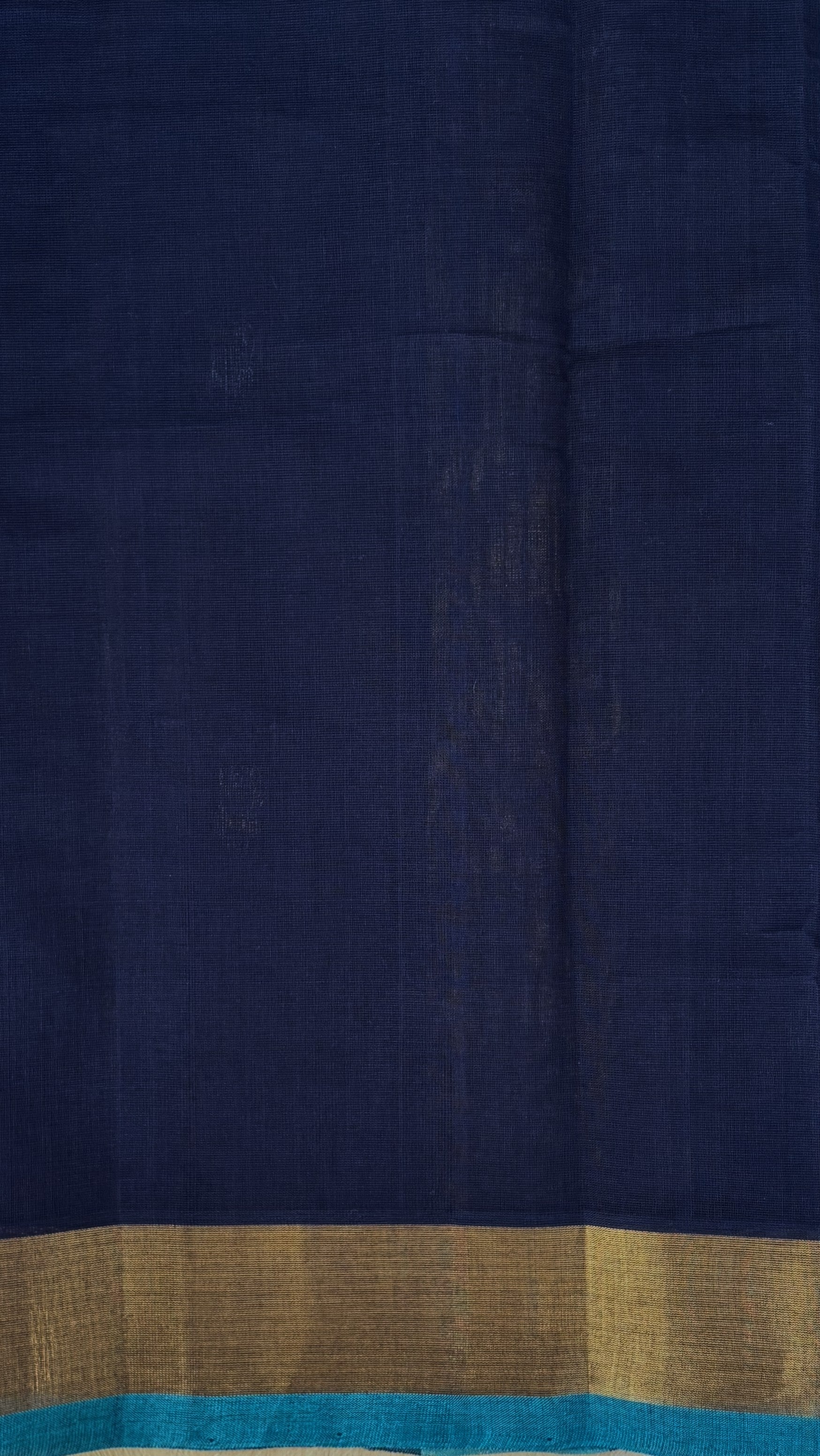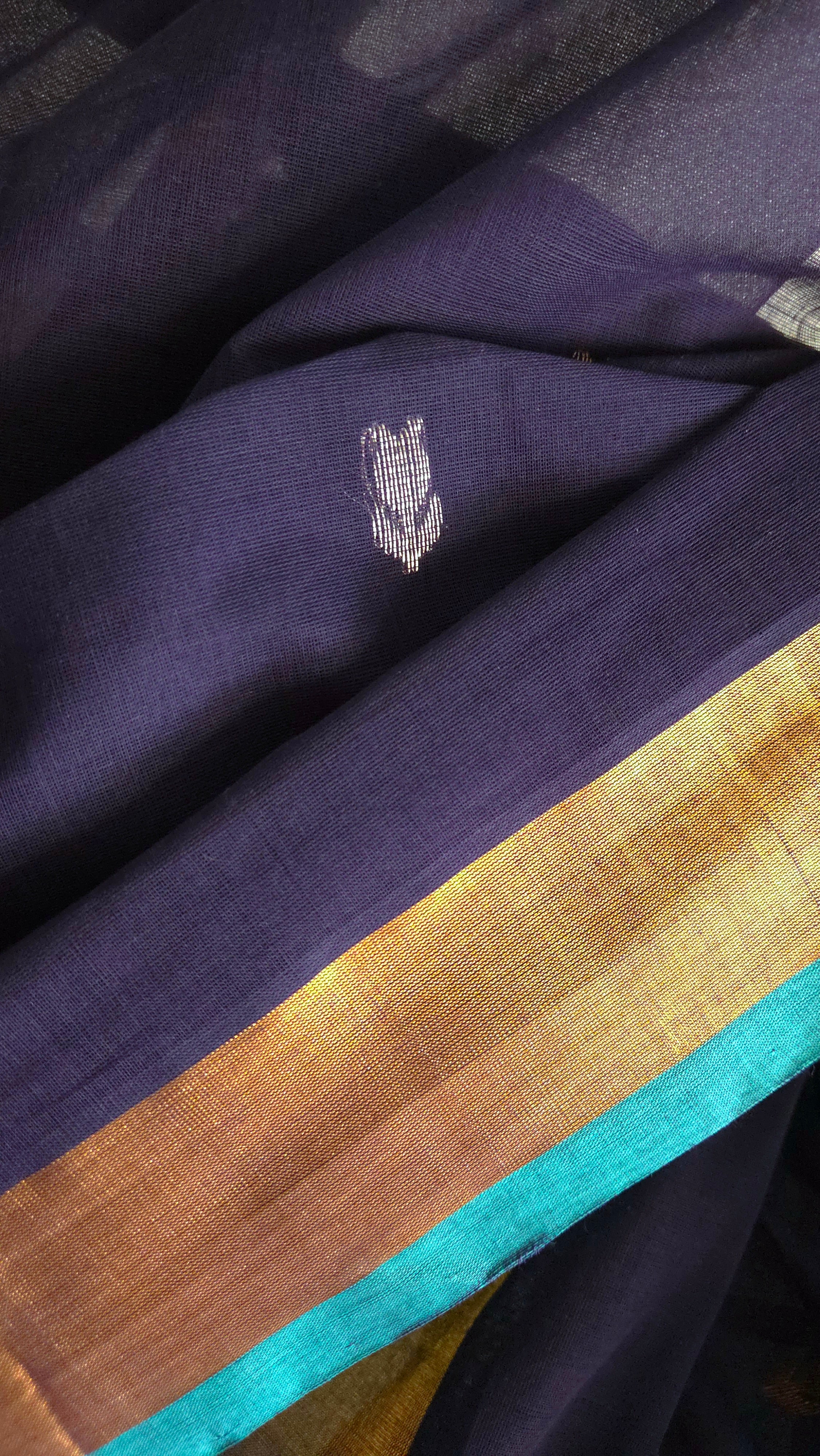 Handwoven cotton Venkatagiri saree in navy blue shade with extra-weft sapling-like motifs woven in gold and silver zari all over the body, creating a luxurious shimmer and a delicate botanical rhythm across the weave.