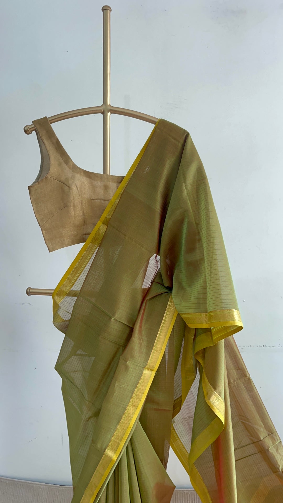 Immerse yourself in the vibrant charm of this handwoven saree, made from soft 100s count cotton in Bengal. The saree features a striking cool brown geometric border, adding a layer of earthy elegance. Its color palette is a playful blend—the lower half in a rich yellow ochre, and the upper half in a lively chrome yellow, both adorned with delicate petal motifs that evoke a sense of blooming beauty.