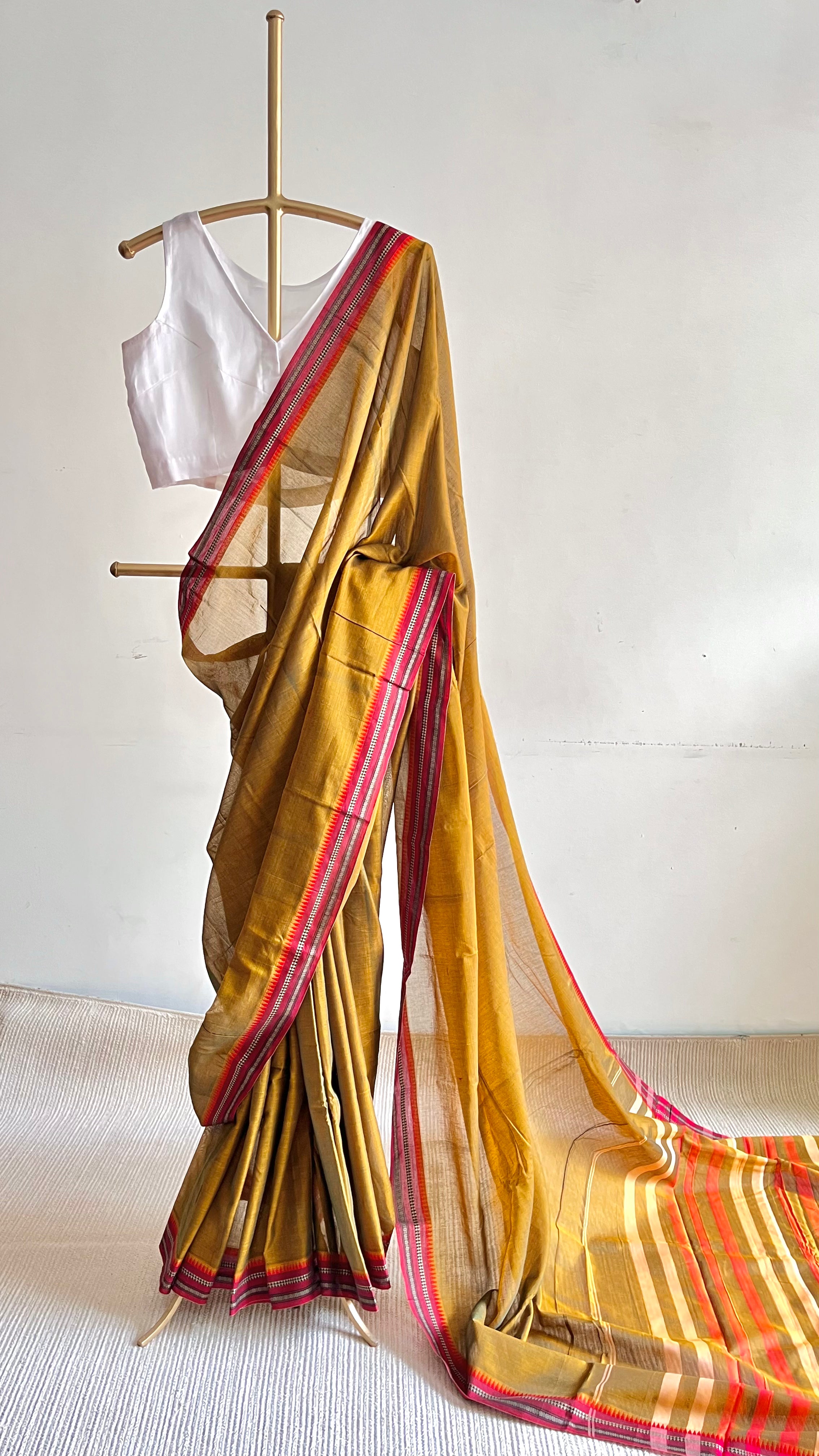 The pallu is woven with striking stripes in red and light orange, ending neatly to balance the body. Perfect to wear for: daytime festive rituals, temple visits, or smart-casual ethnic occasions.