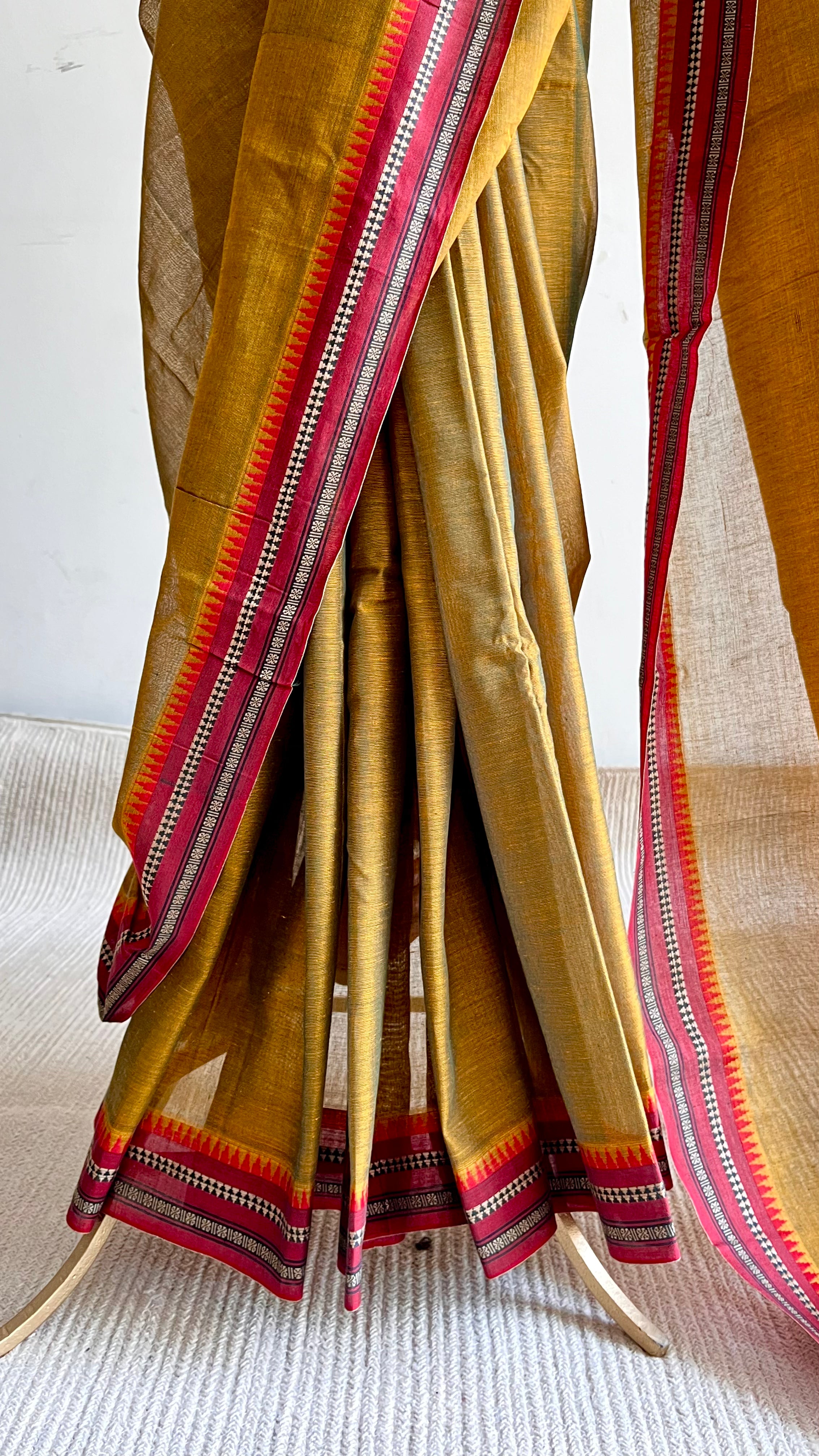 This mercerised cotton saree is woven in a shot colour of yellow and black that reads as a warm yellow-henna base. The mercerised finish gives the body a soft, luminous sheen but has a drape that holds pleats well while feeling light against the skin.
