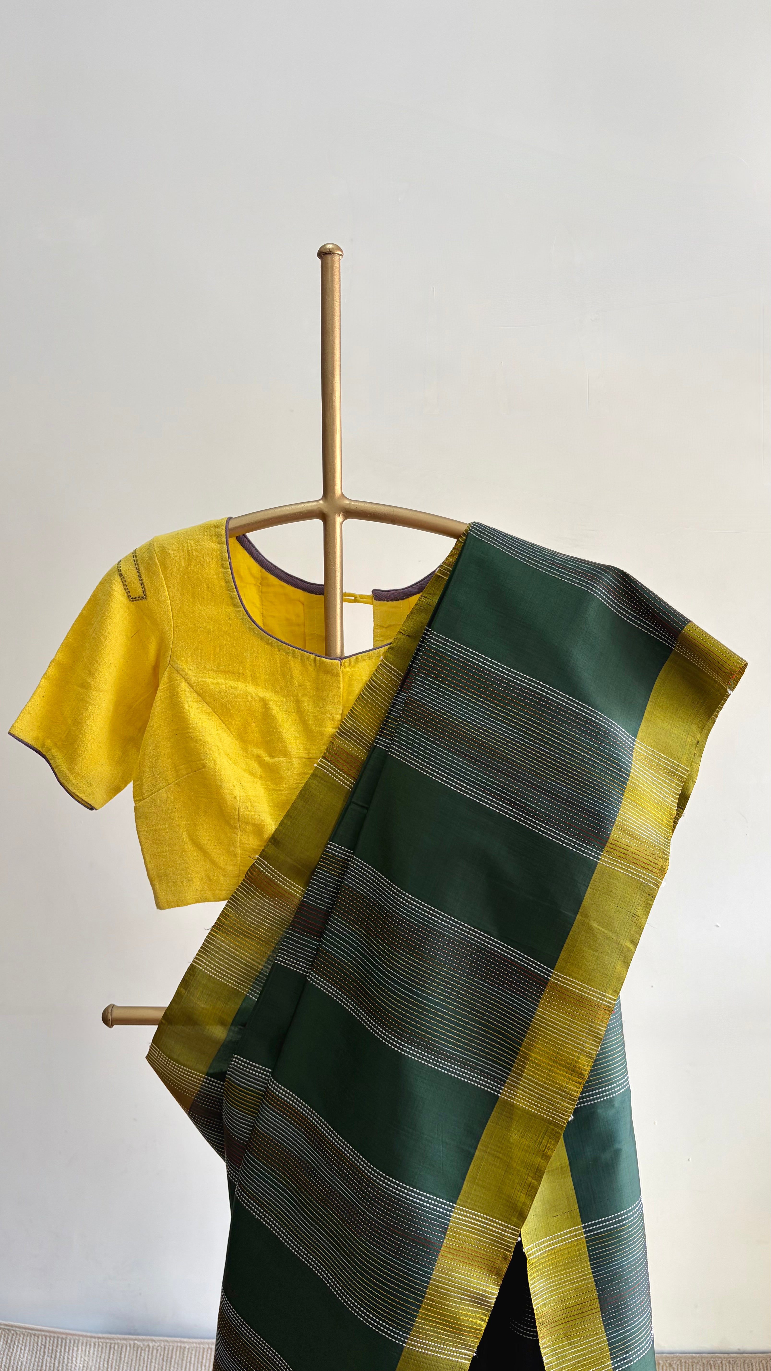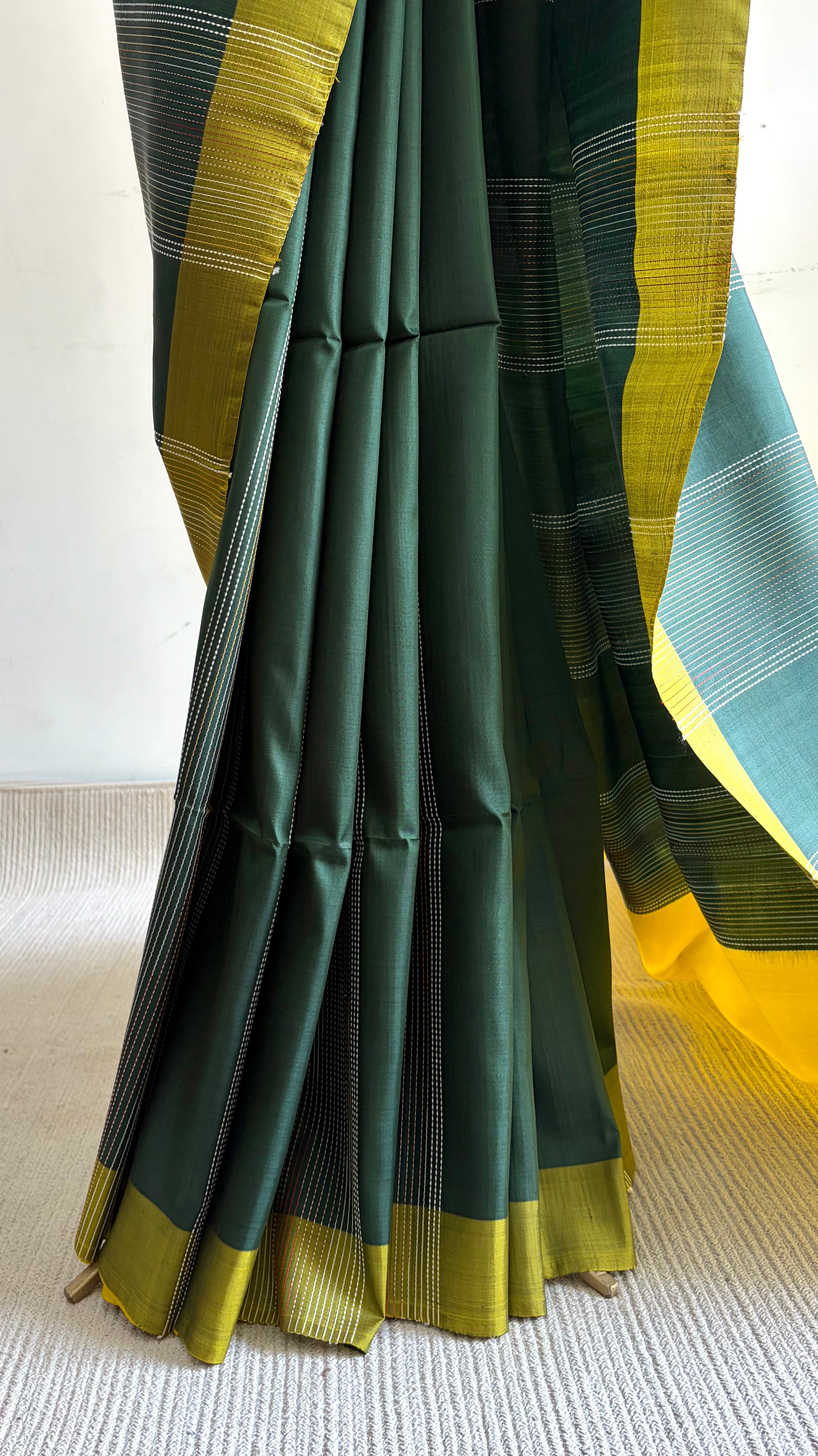 Lustrous, airy, and regal, this interwoven extra-weft saree celebrates the richness of handwoven craftsmanship. The speciality of the saree lies in its additional weft yarns that create subtle geometric patterns across the body. Woven in a dark green shade, the body features extra-weft vertical stripes in white, yellow, and red, with bands of the base green left plain in between, allowing the weave to breathe while adding layered texture and a refined geometric visual.