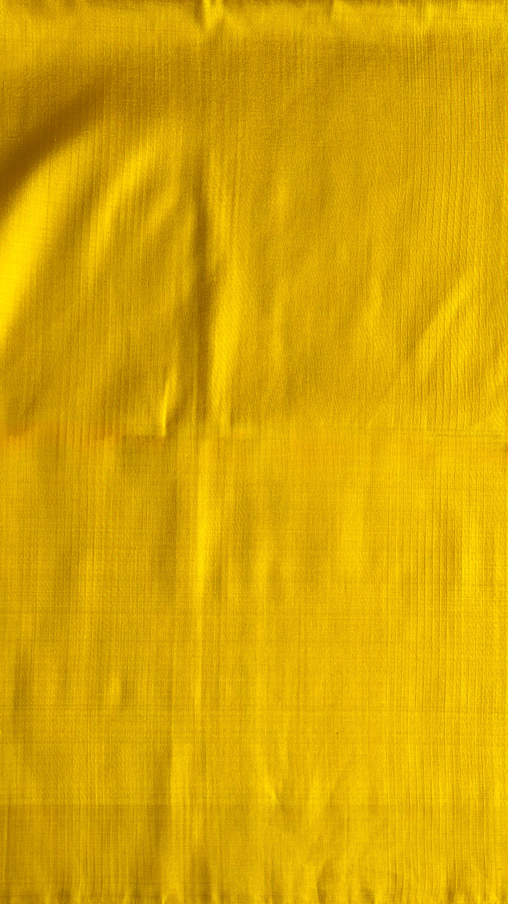 The pallu comes in a bright lemon yellow shade and features extra-weft bands woven through it, lending the pallu a clean yet distinctive finish.
