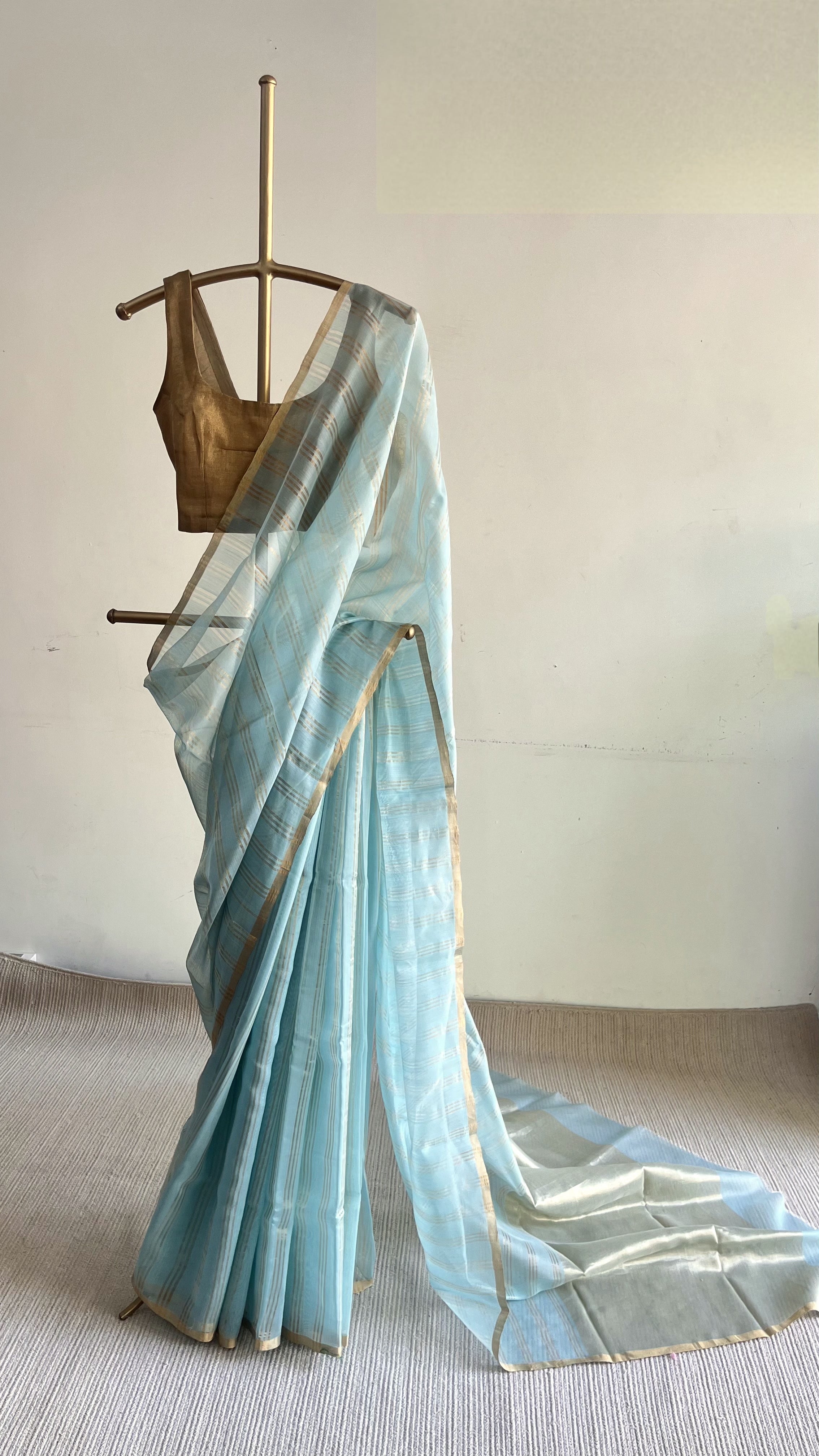A soft Chanderi silk-cotton saree in a baby blue shade, highlighted with vertical bands of gold zari stripes woven across the body, creating a delicate play of light and texture.