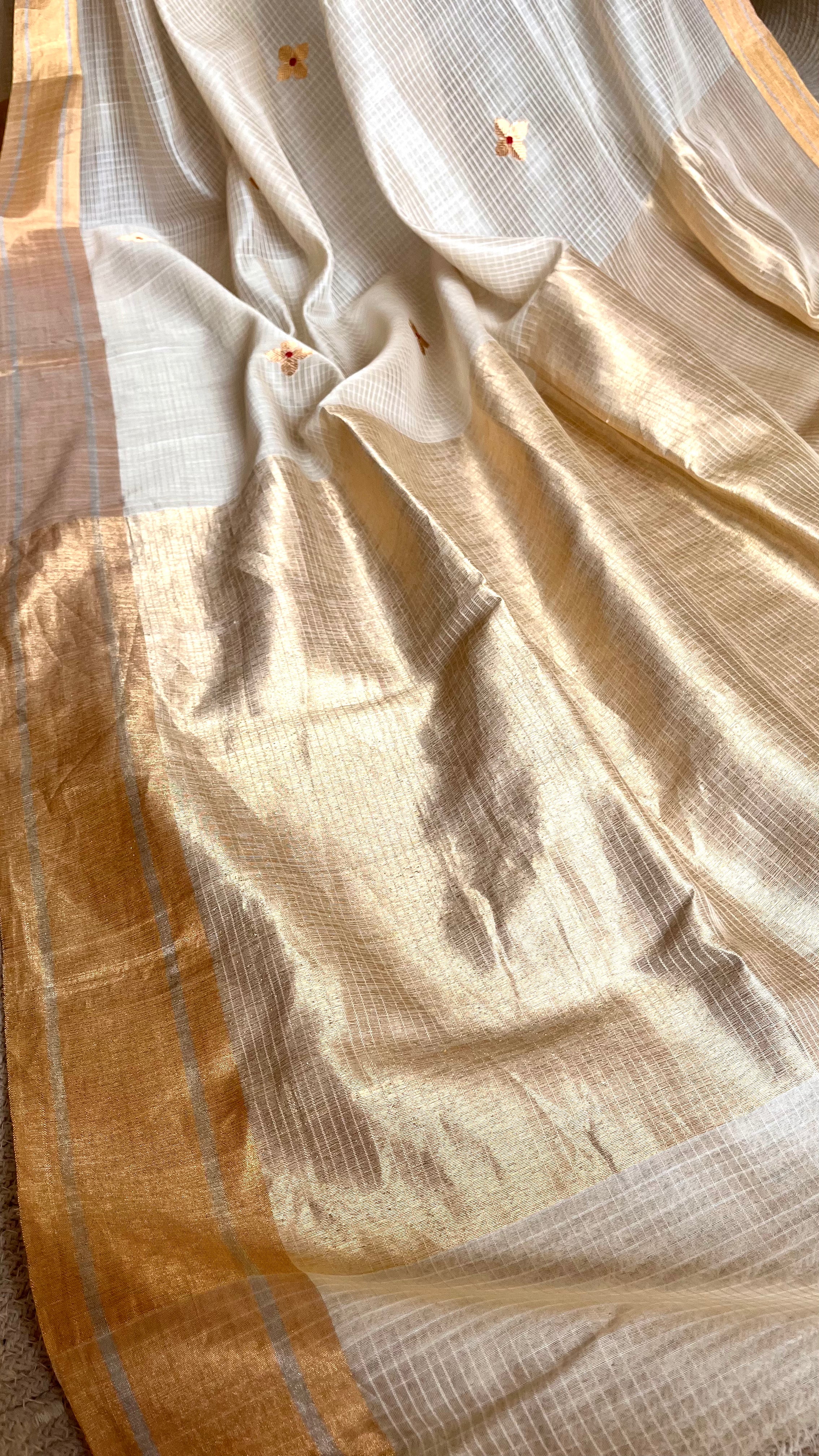 The body of this handwoven silk cotton Chanderi saree is crafted in a classy ivory shade with a translucent texture. It features a fine checkered weave in white, while elegant floral motifs are woven across the body in gold zari with delicate red detailing that adds a subtle highlight.